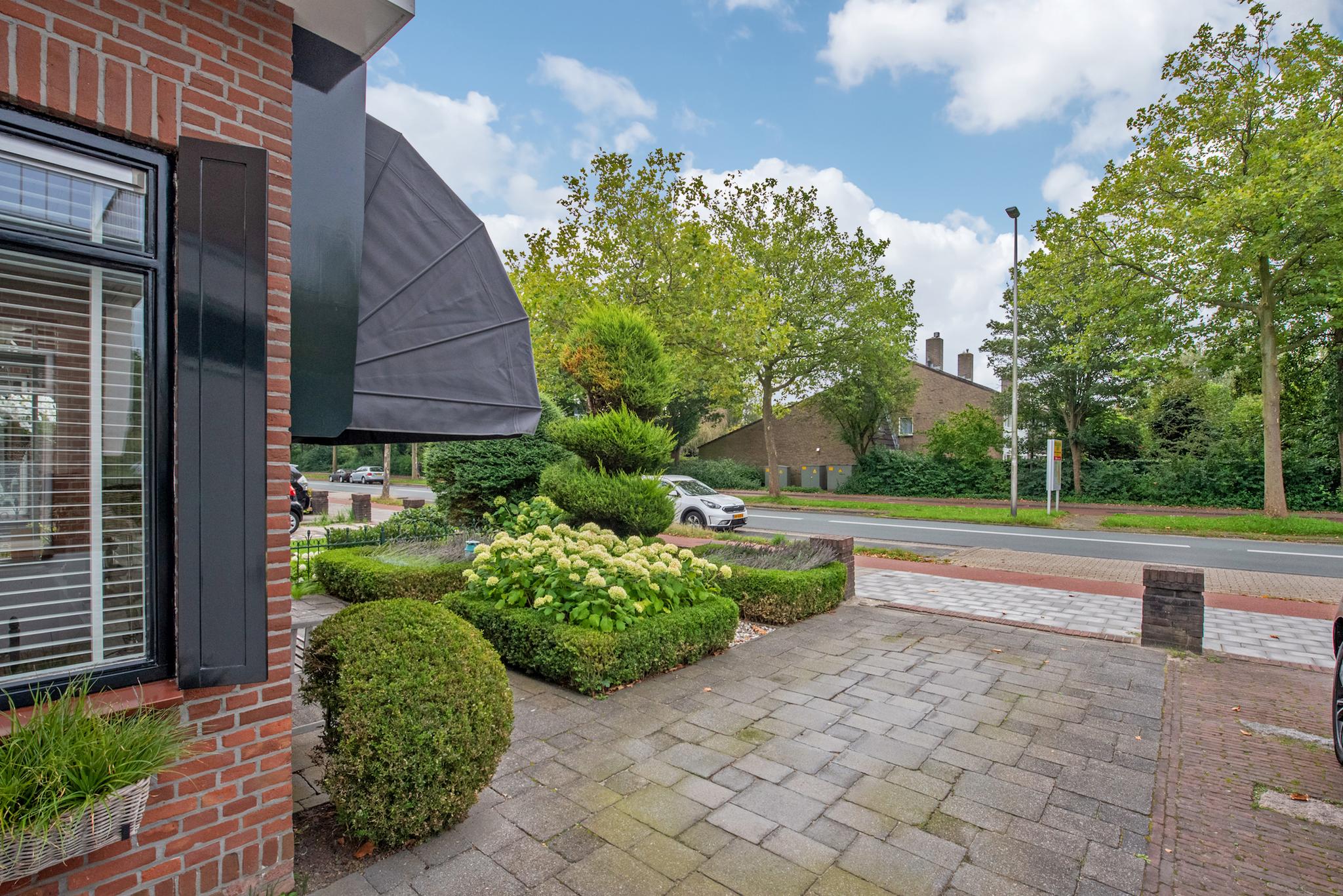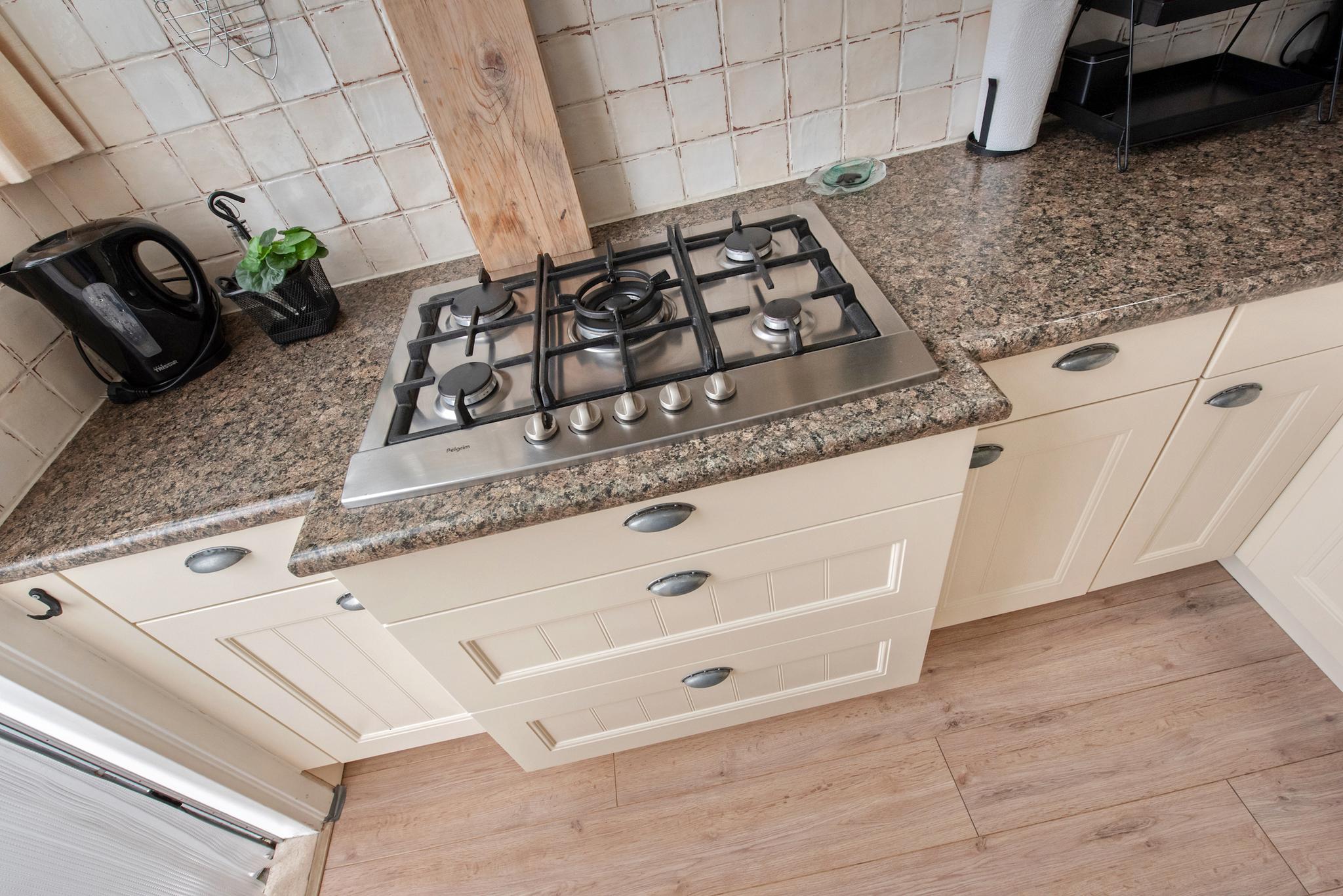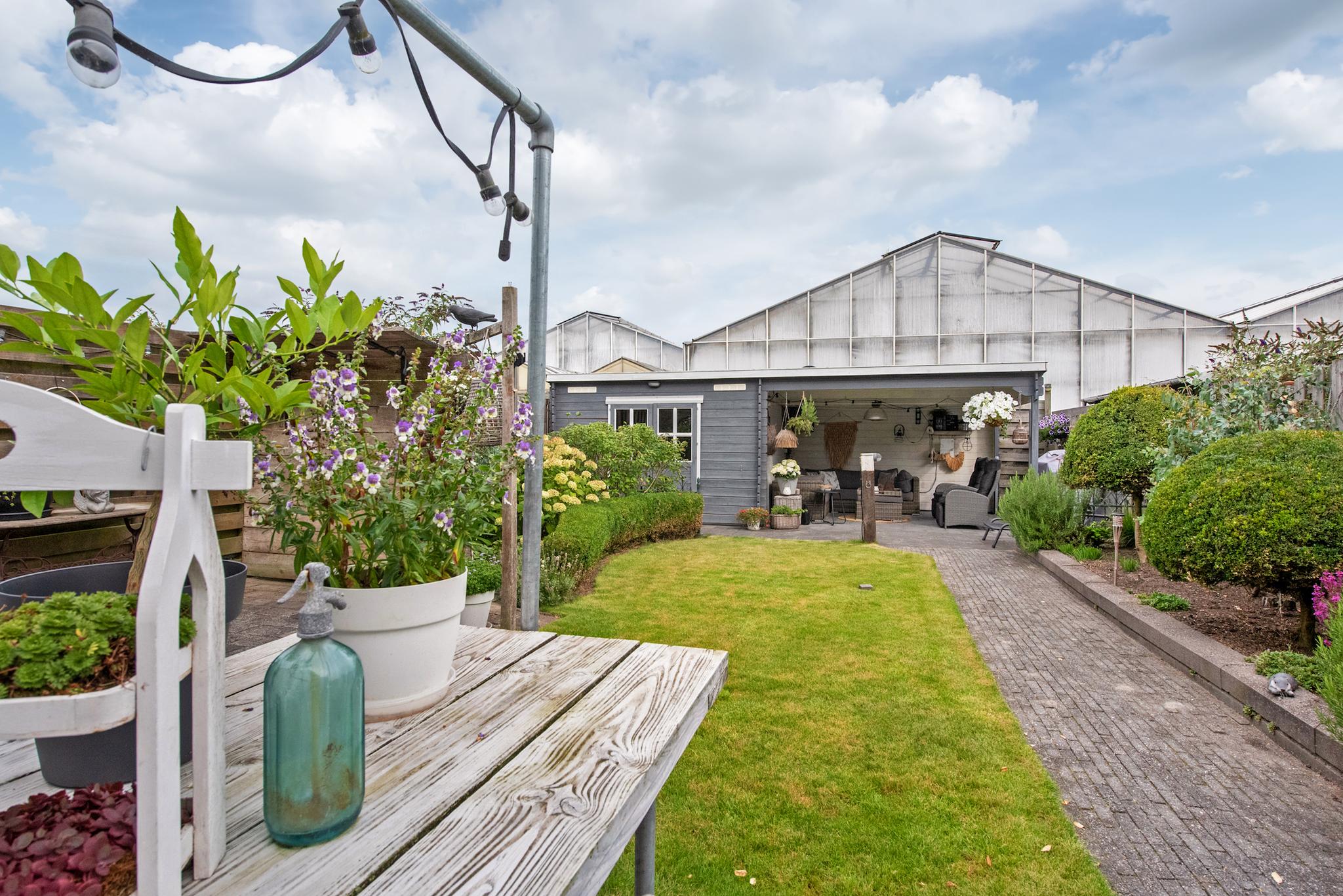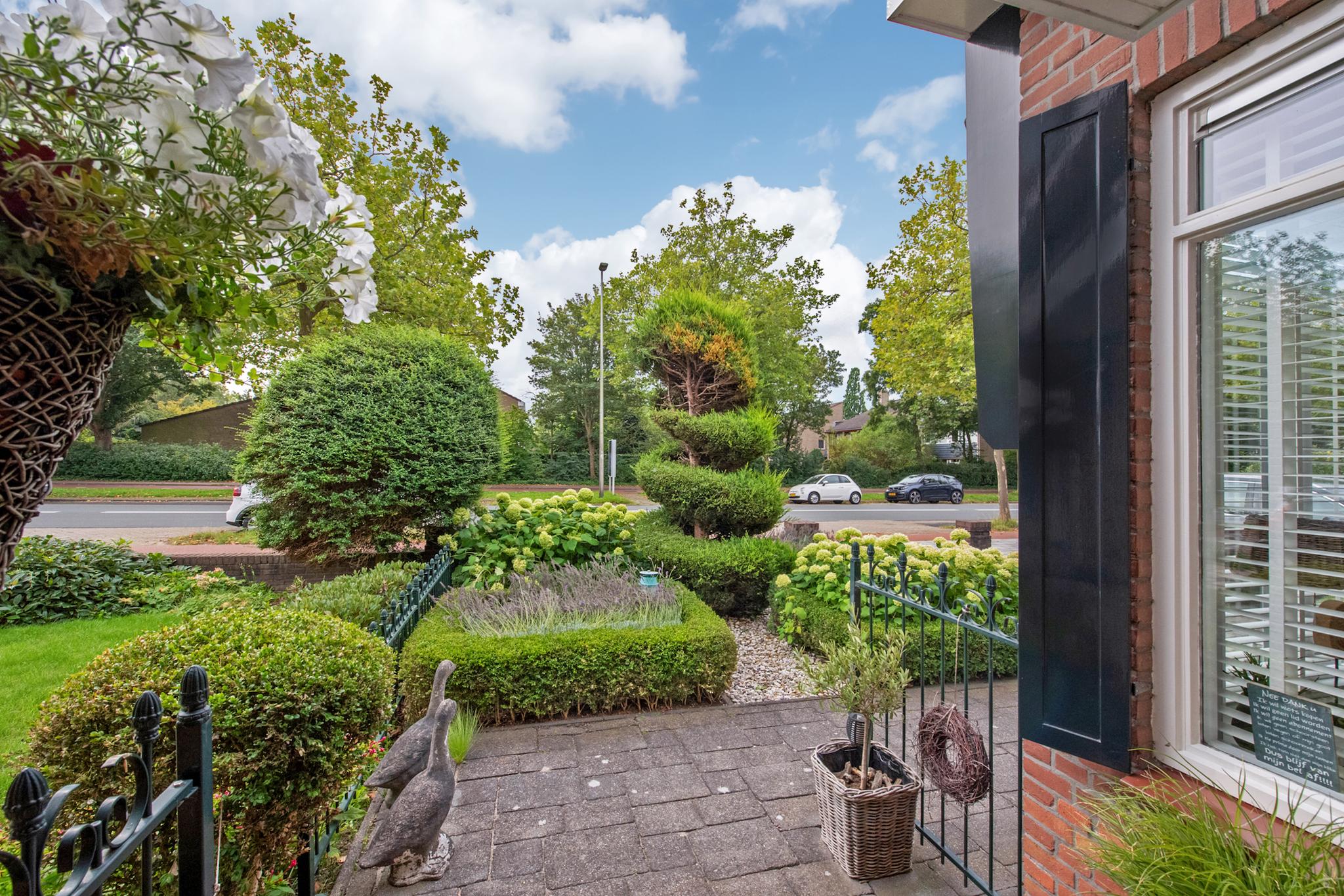 Entree met meterkast, toiletruimte en gang met prachtig trappenhuis en glas-in-lood deur. Royale woonkamer opgedeeld in zit- en eetgedeelte, optisch met een toog gescheiden, op de vloer ligt een houtlook laminaat. Aan de achterzijde van de woning staat de keuken in een grote L-vorm opgesteld met extra vrijstaande blok voor apparatuur, de keuken is in landhuisstijl en beschikt over enige inbouwapparatuur. Grote bijkeuken/berging naast de woning met aansluiting voor wasmachine/droger, uitstortgootsteen en opstelling CV combi ketel. Vanuit de achterzijde is de heerlijke achtertuin toegankelijk met diverse leuk ingerichte hoekjes, gazon en een fijne veranda/overkapping waardoor je lang van het buitenleven kunt genieten.