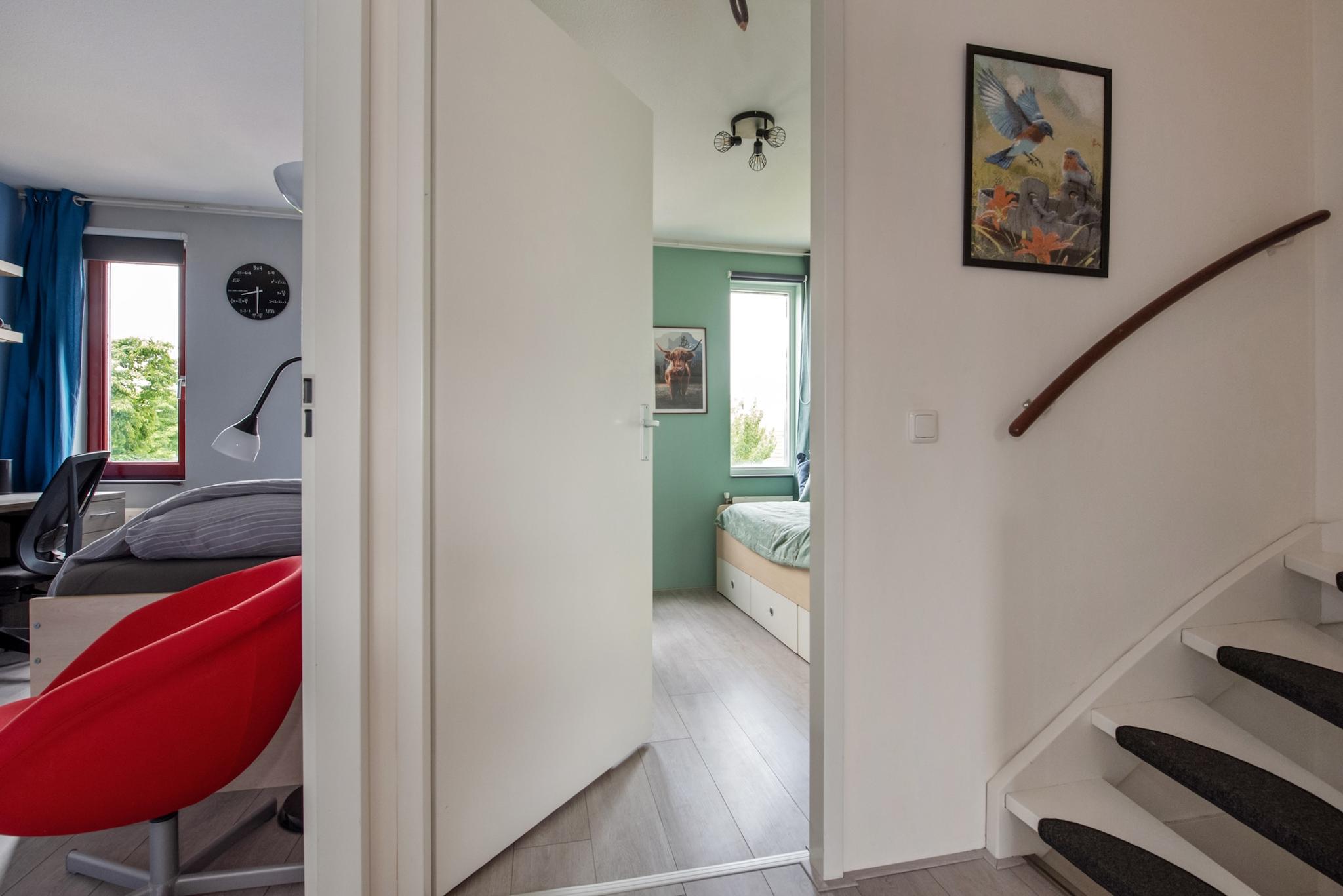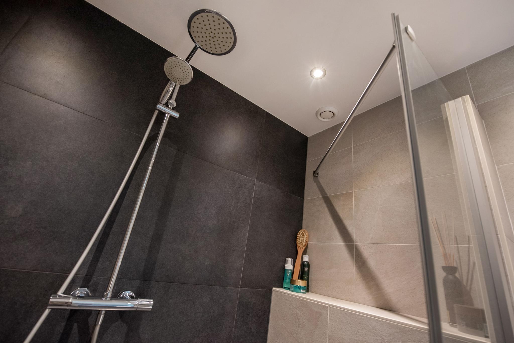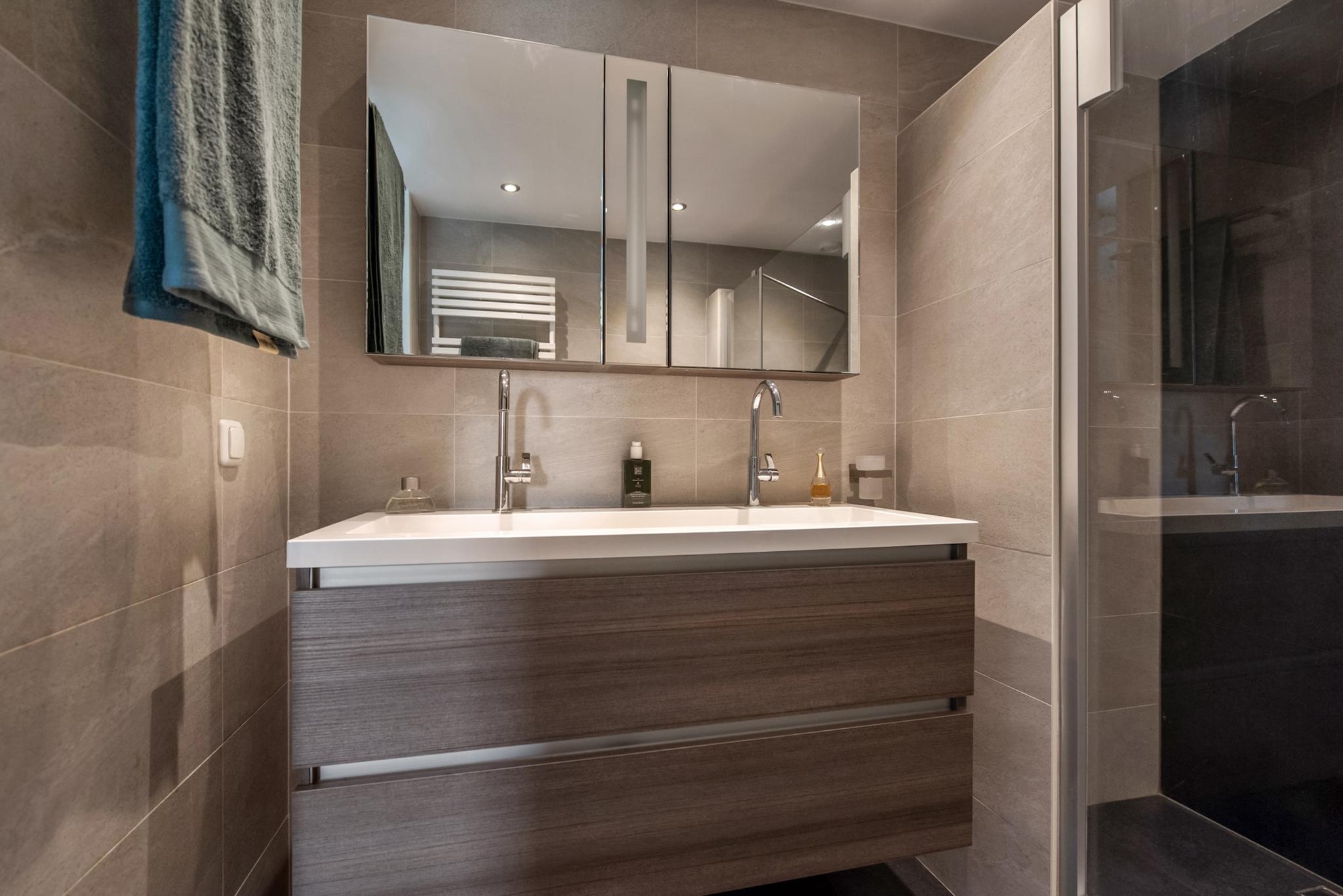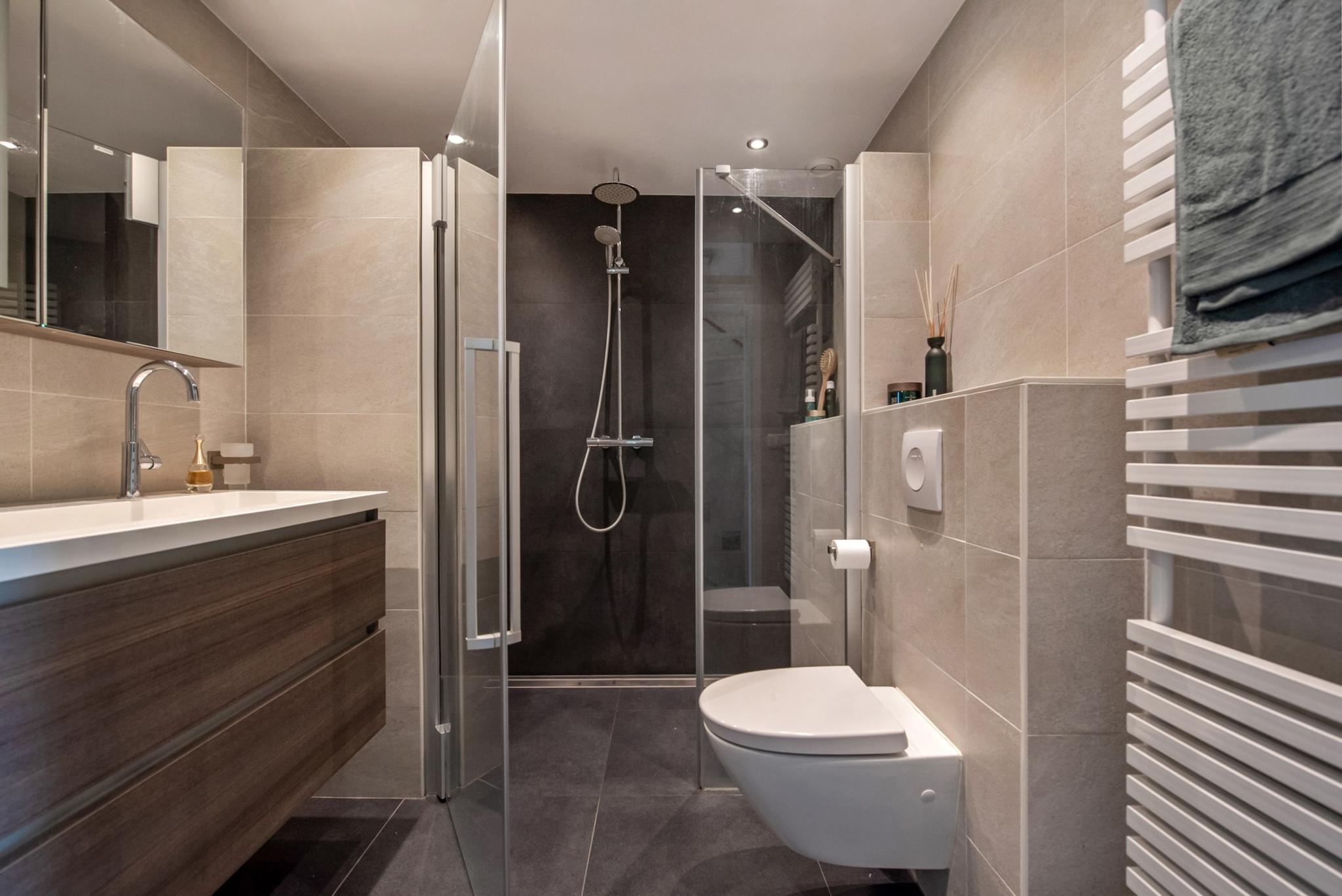 1e Verdieping: Overloop met aparte kast annex wasruimte. 2 Slaapkamers aan de voorzijde. Recent gemoderniseerde badkamer met trendy tegelwerk, fijne inloopdouche en fraai wastafelmeubel. Grote slaapkamer achterzijde over de volle breedte van de woning.