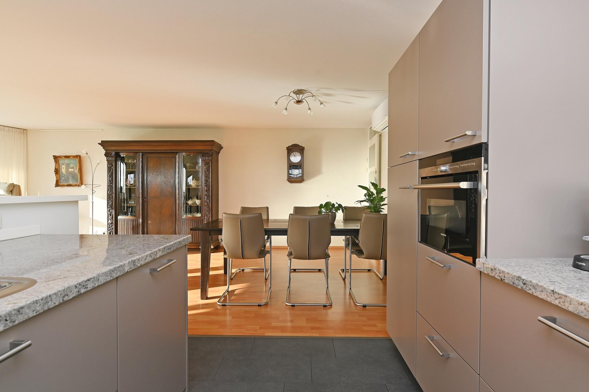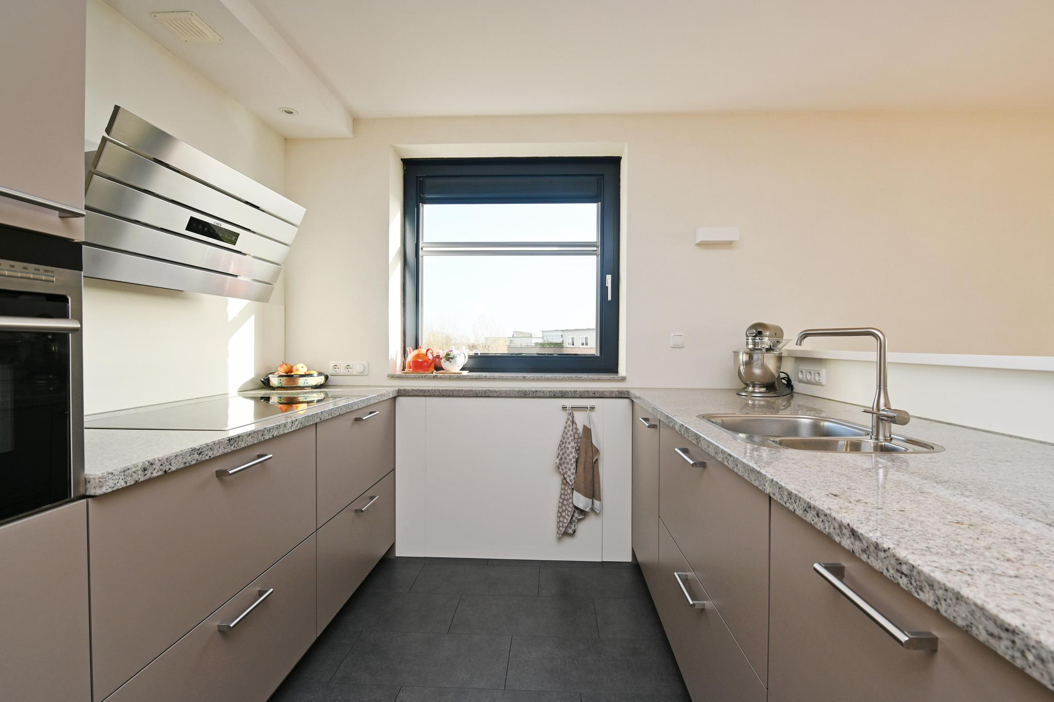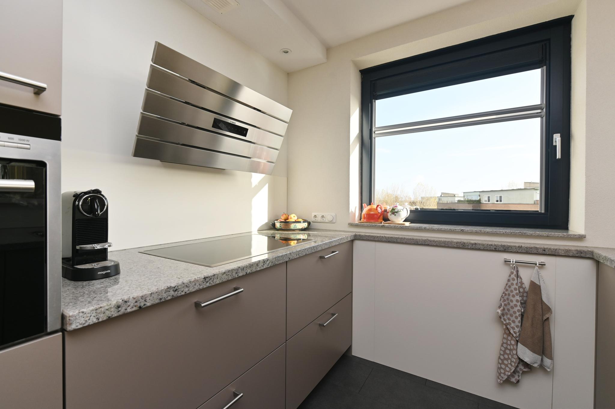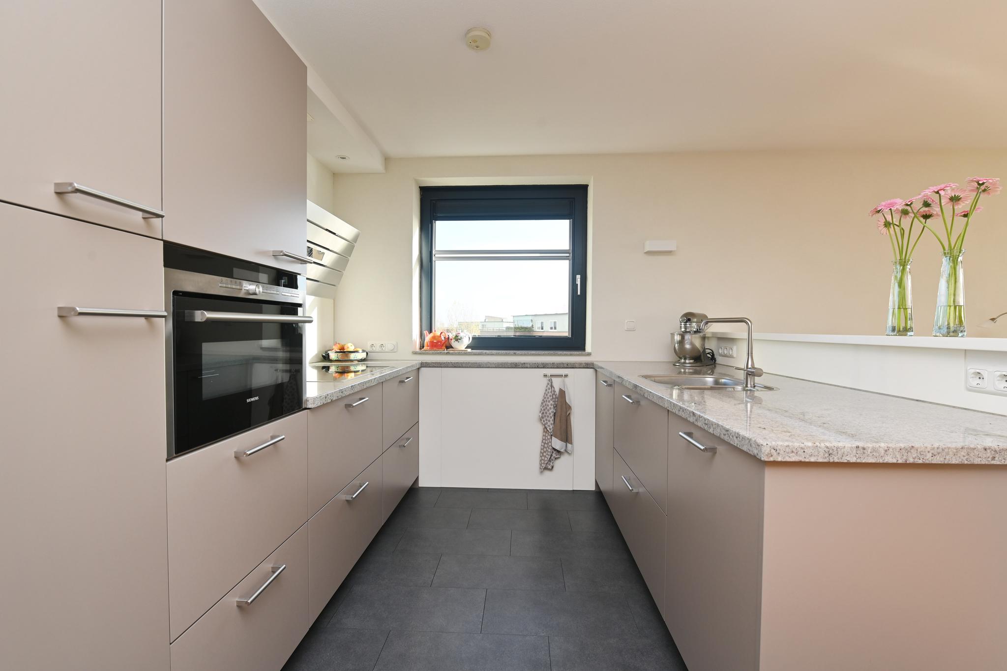 Luxe open keuken in een prachtige taupe kleur, mooi natuurstenen aanrechtblad en v.v. diverse inbouwapparatuur. Vanuit de woonkamer is een royaal balkon toegankelijk, v.v. elektrisch bedienbaar zonnescherm. Prachtig uitzicht over een grote waterpartij, op Delft en op de Skyline van Rotterdam.
