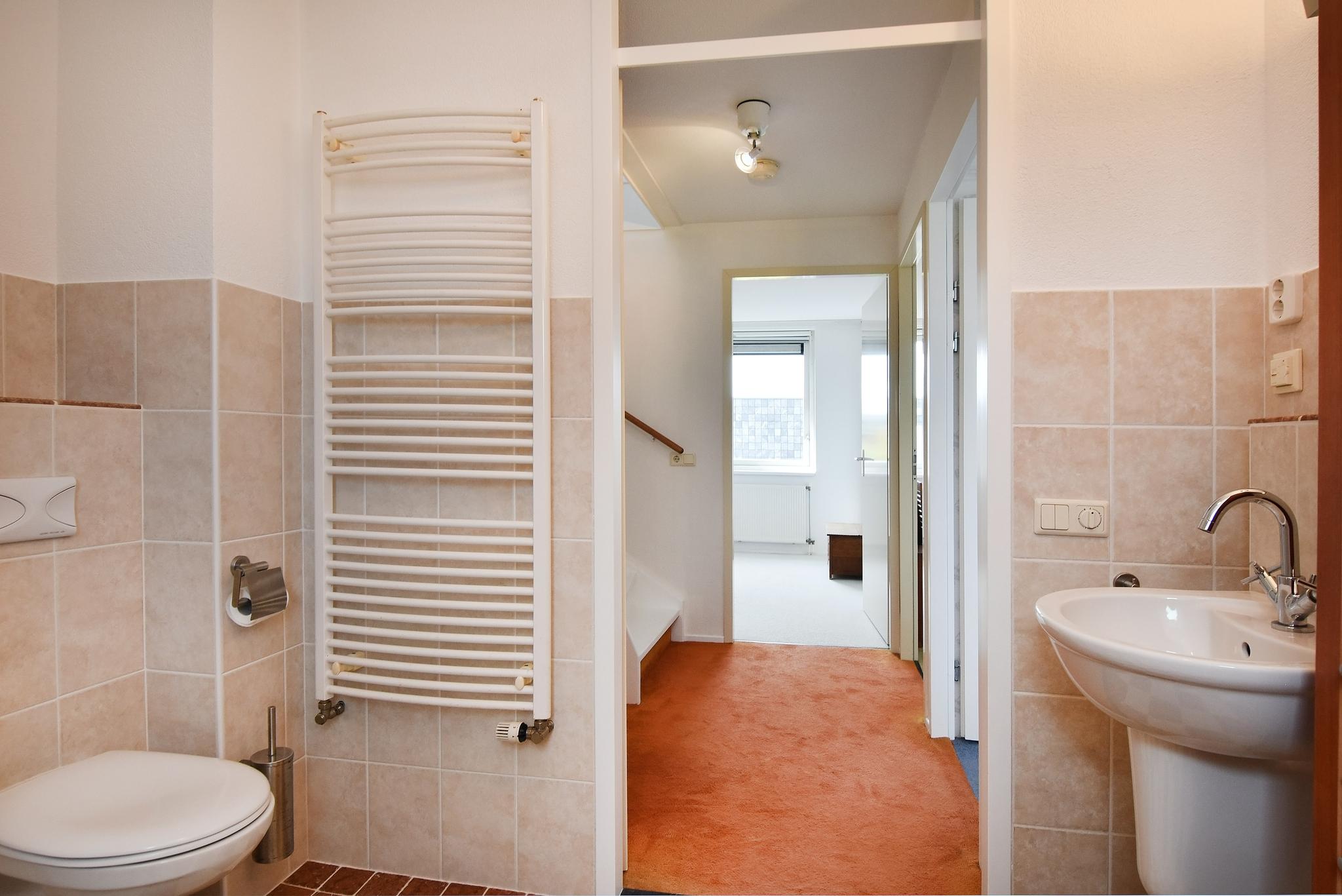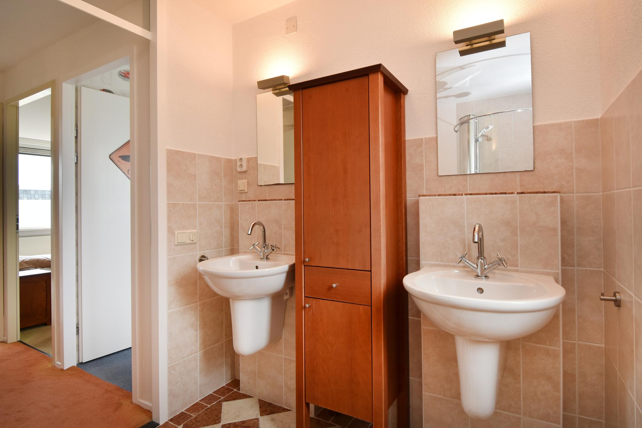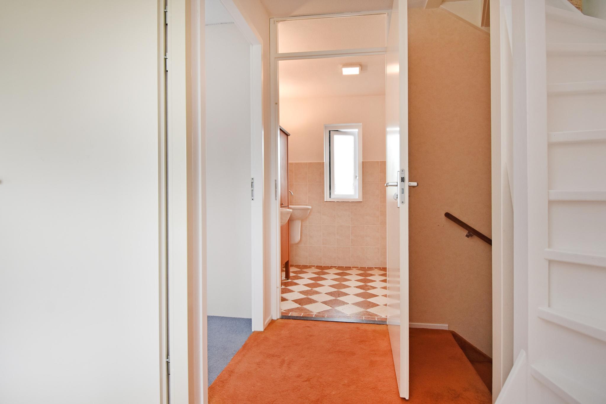 1e verdieping: Overloop, 3 slaapkamers, 2 slaapkamers aan de achterzijde en 3e slaapkamer aan de voorzijde. Aan de voorzijde bevindt zich de badkamer, voorzien van douchecabine, 2e toilet, twee wastafels en een badkamermeubel.