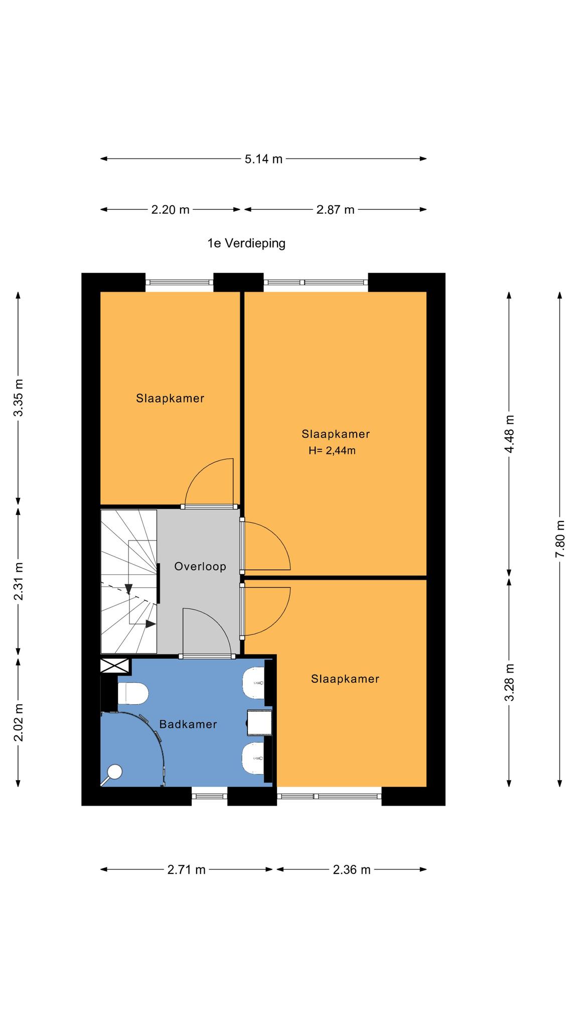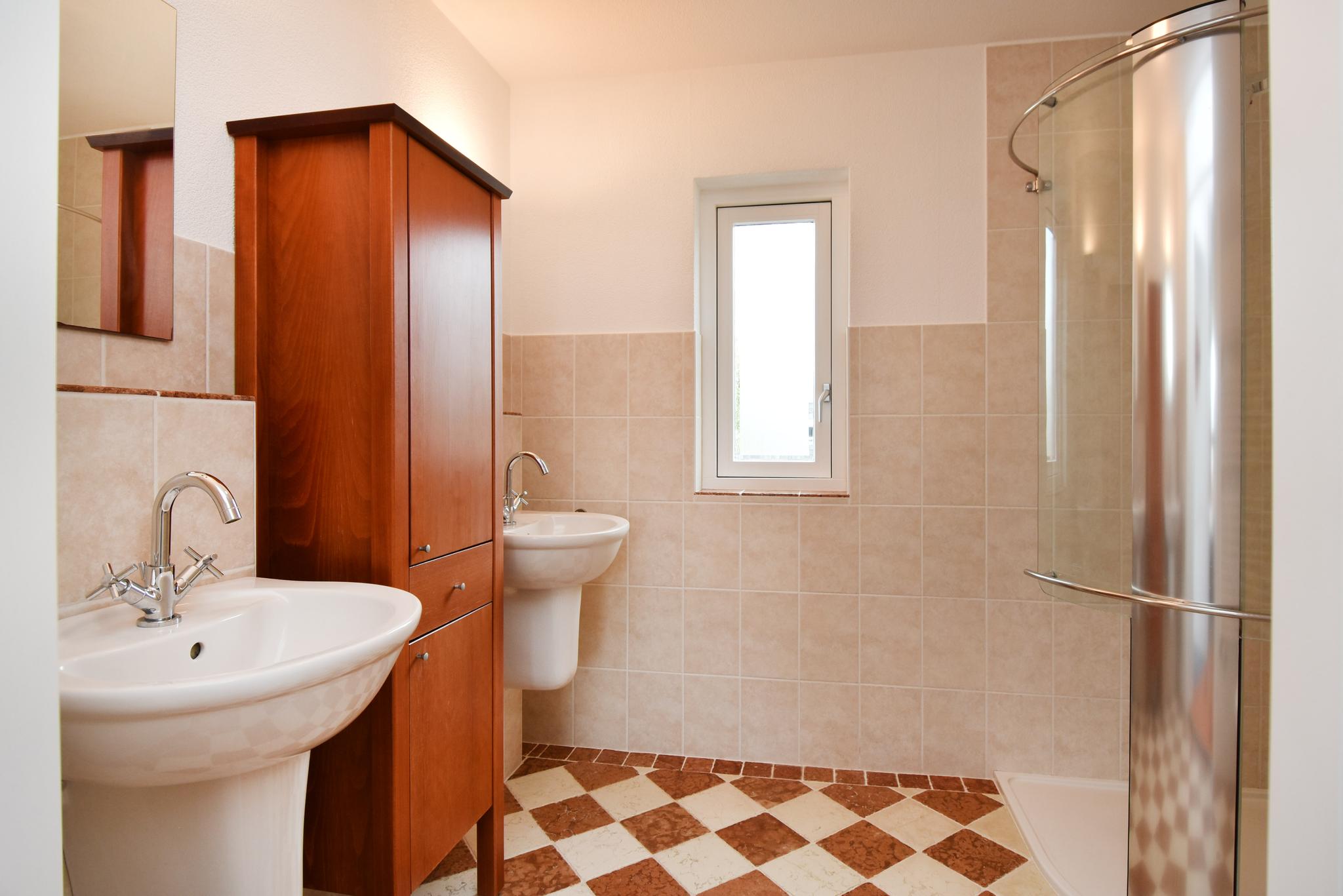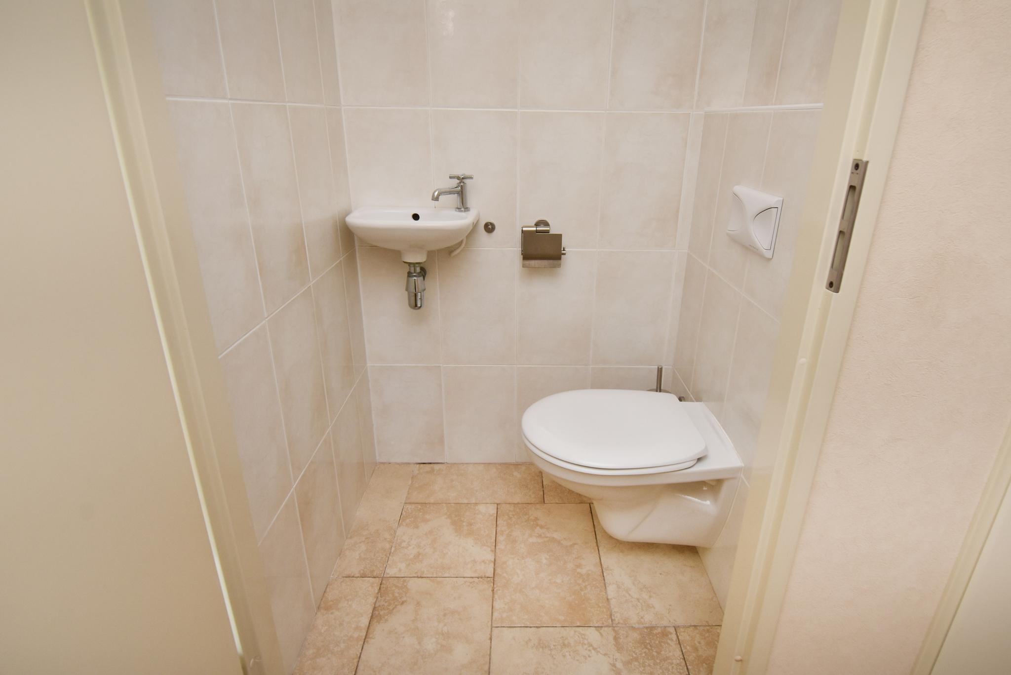 1e verdieping: Overloop, 3 slaapkamers, 2 slaapkamers aan de achterzijde en 3e slaapkamer aan de voorzijde. Aan de voorzijde bevindt zich de badkamer, voorzien van douchecabine, 2e toilet, twee wastafels en een badkamermeubel.