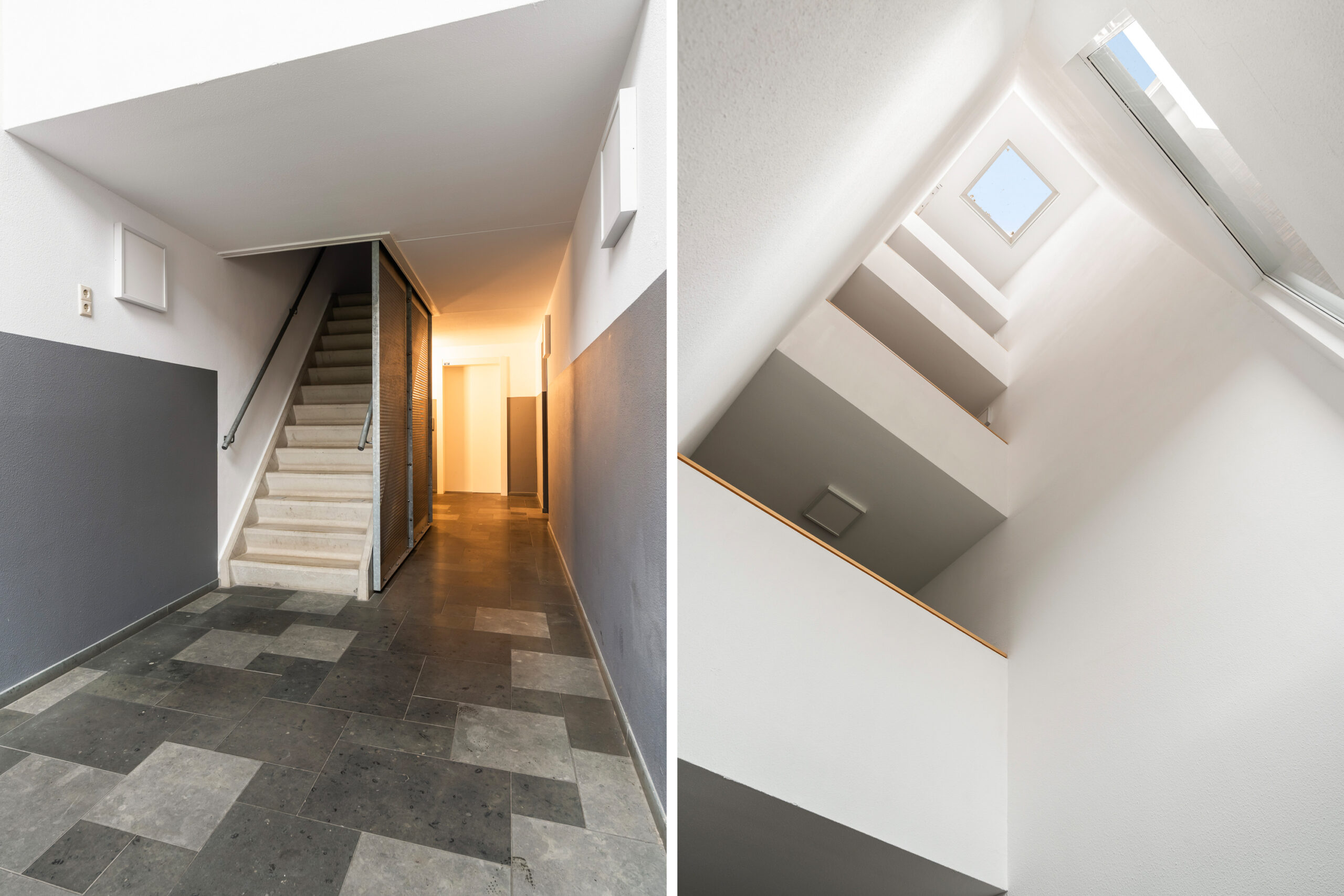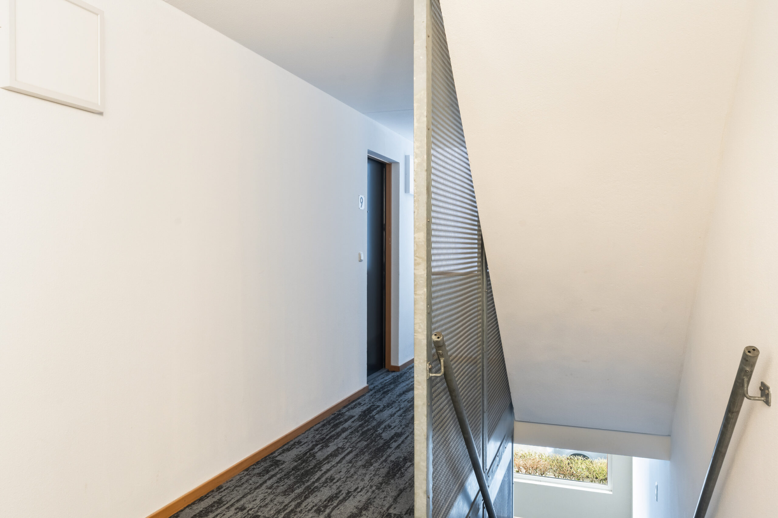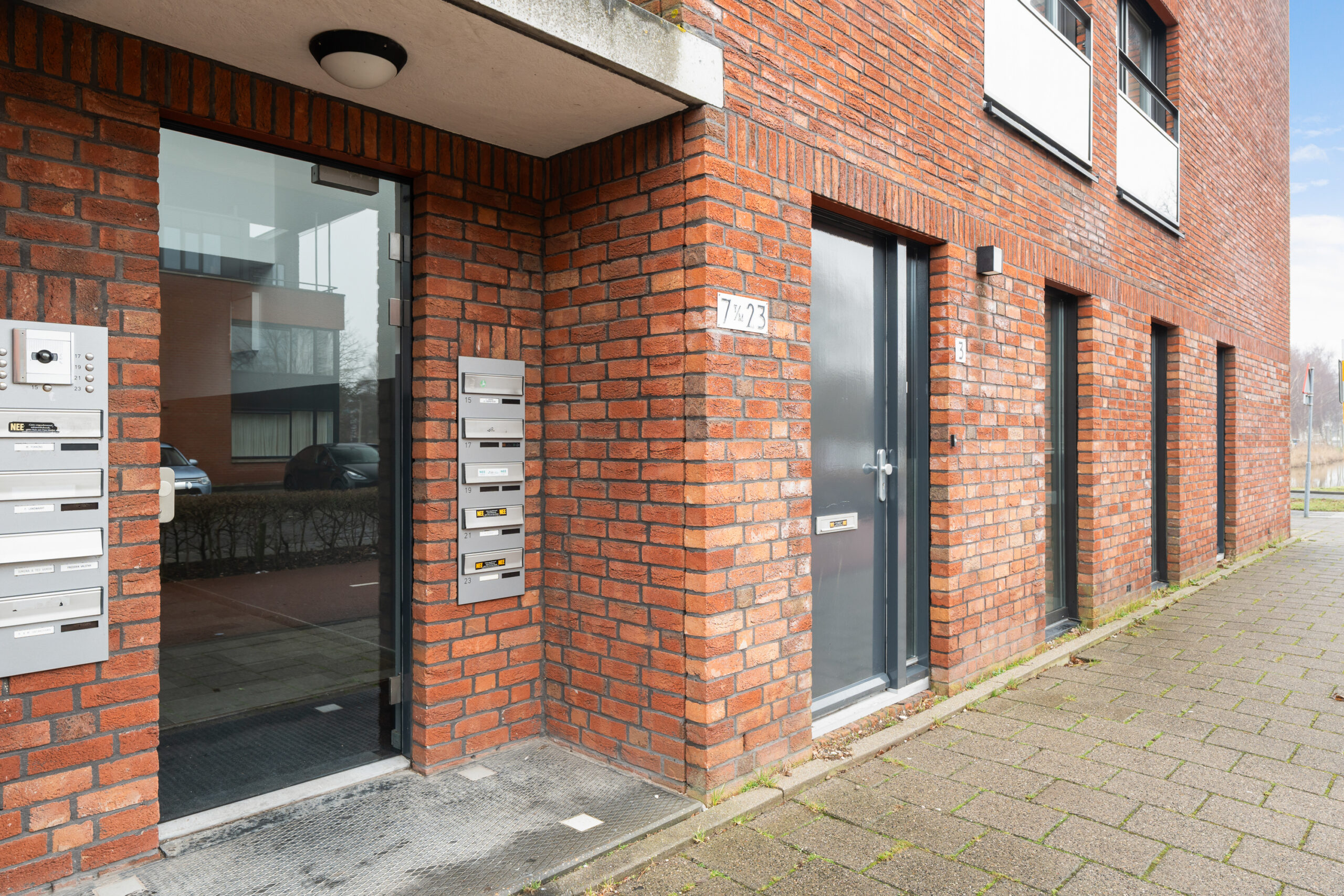 Afgesloten entree met bellentableau en brievenbussen.