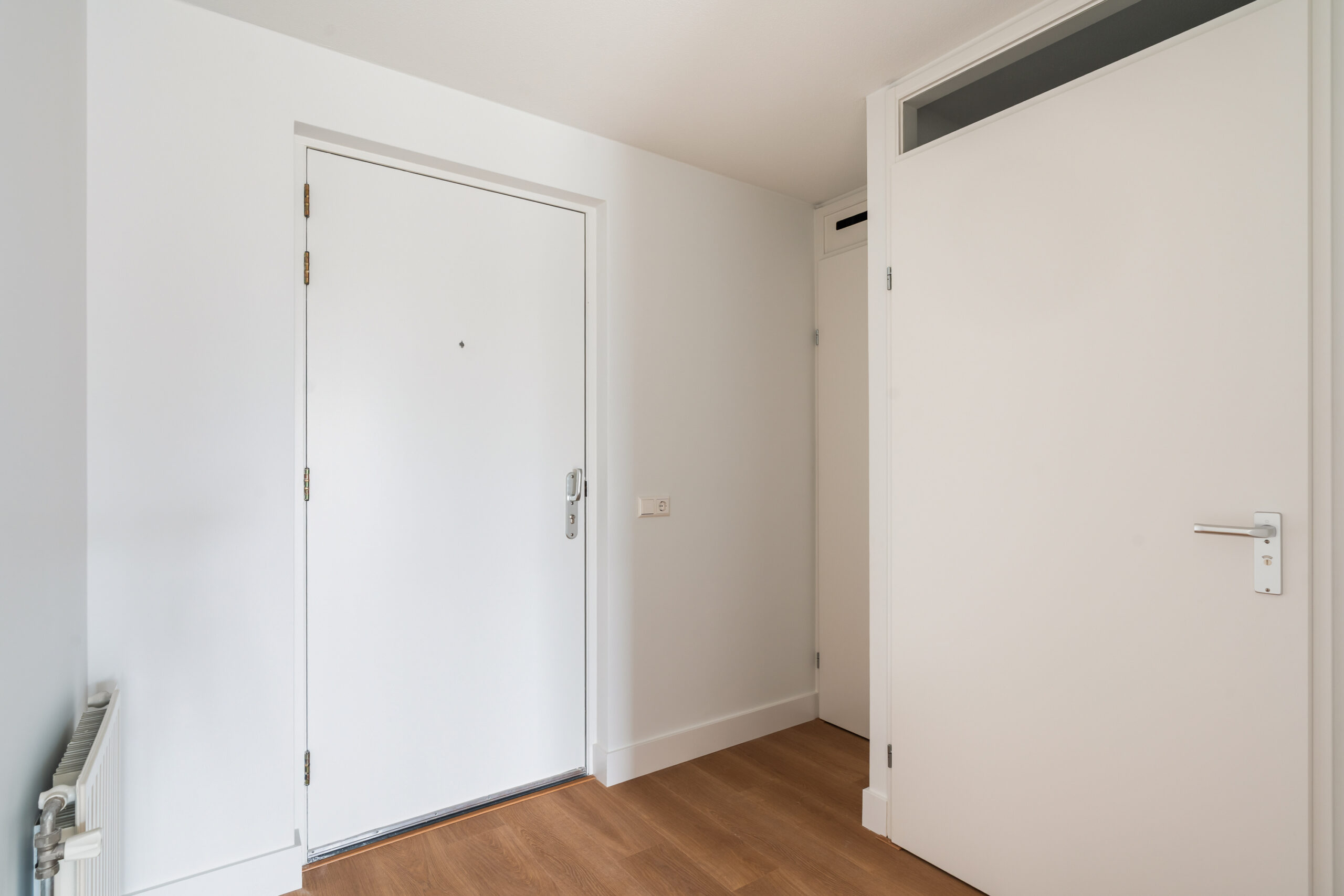 Gang met meterkast, toilet, stookruimte en toegang tot slaapkamers, badkamer en woonkamer.