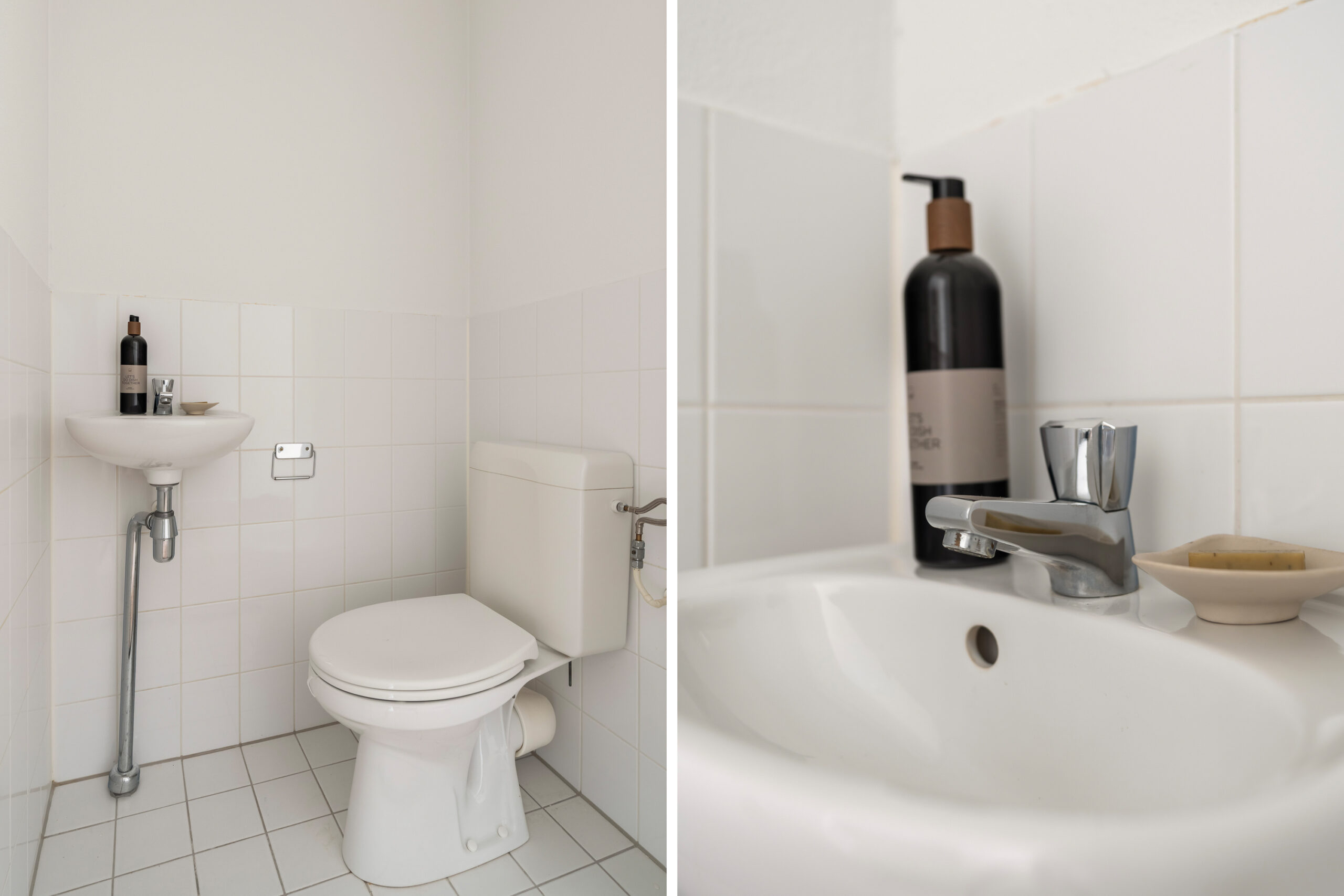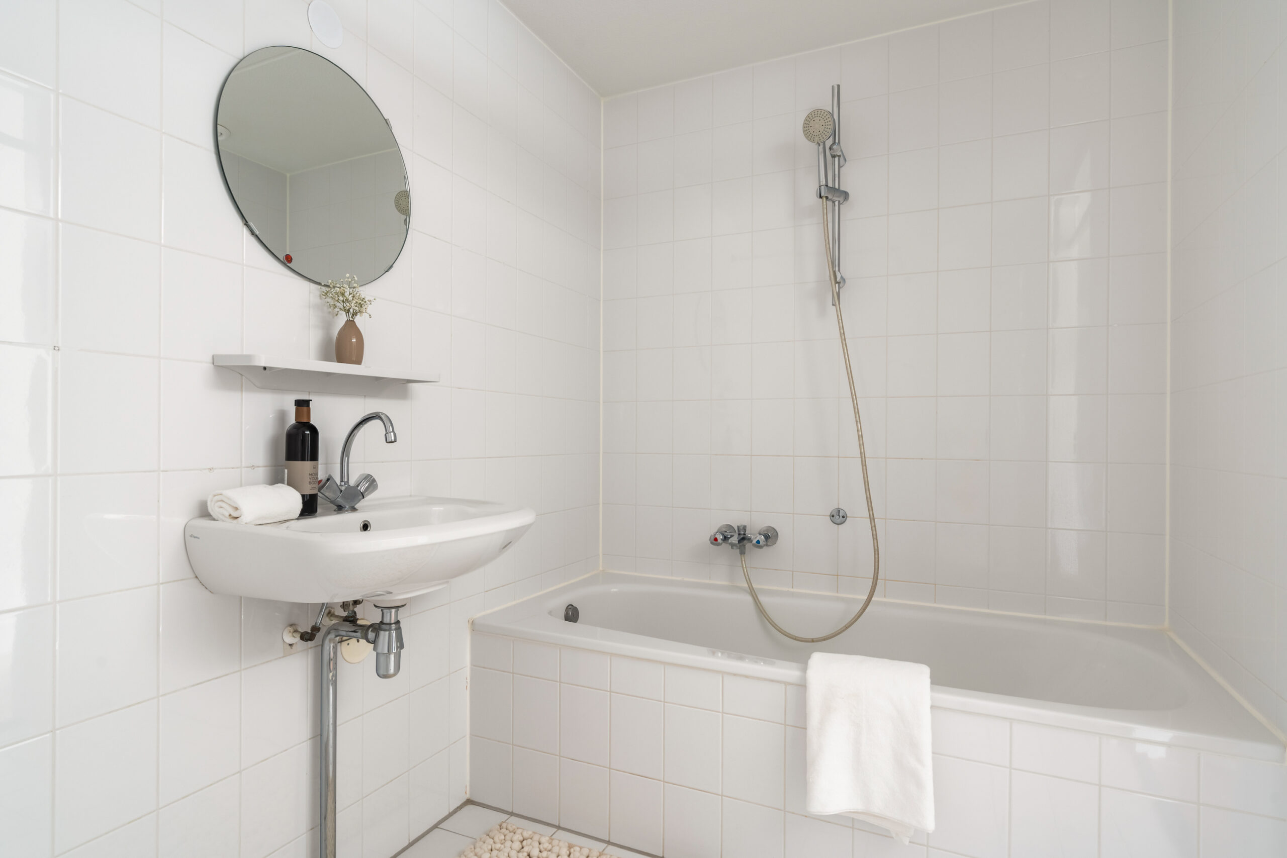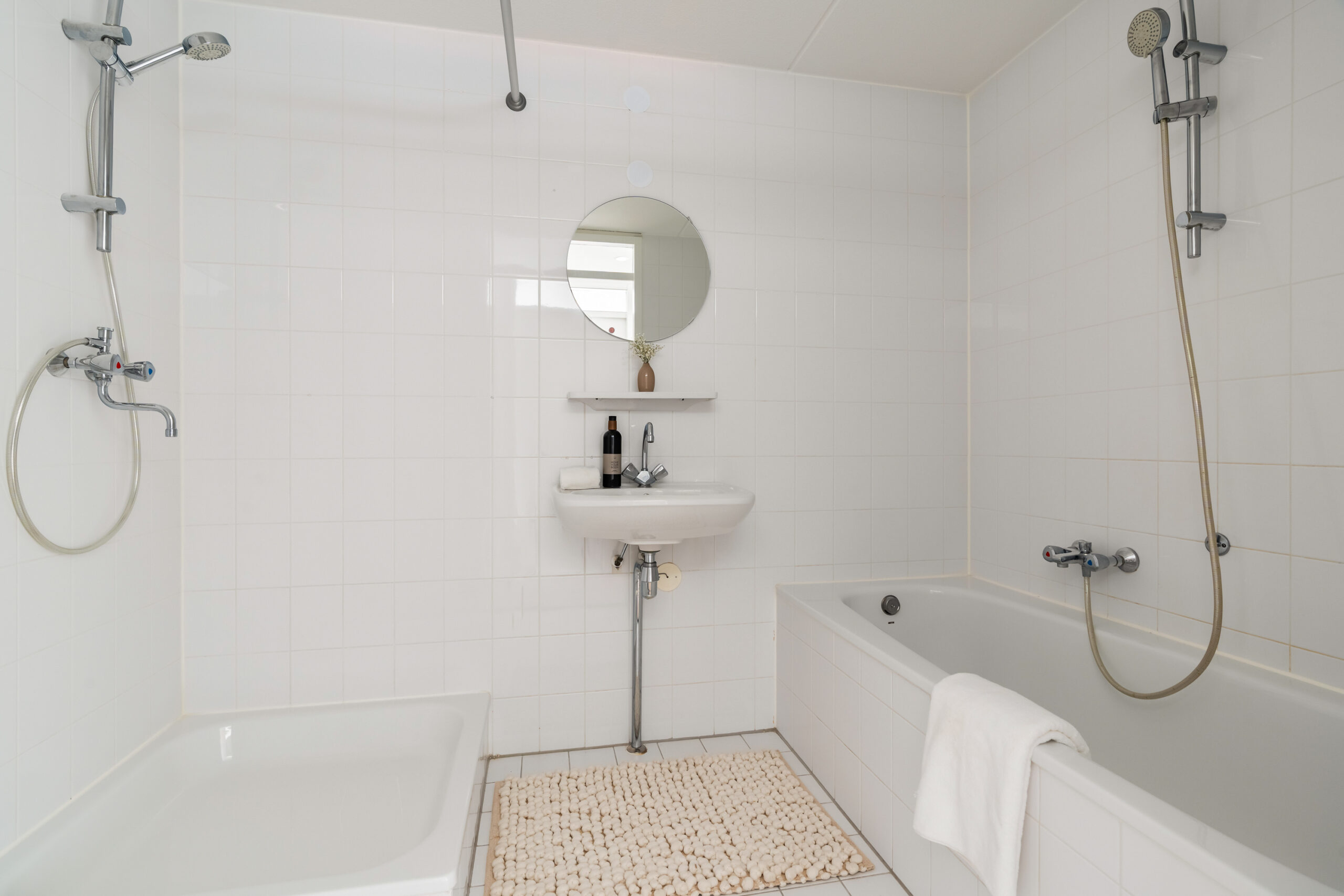 Badkamer met douche, ligbad en wastafel. In de badkamer aansluiting voor de wasapparatuur.