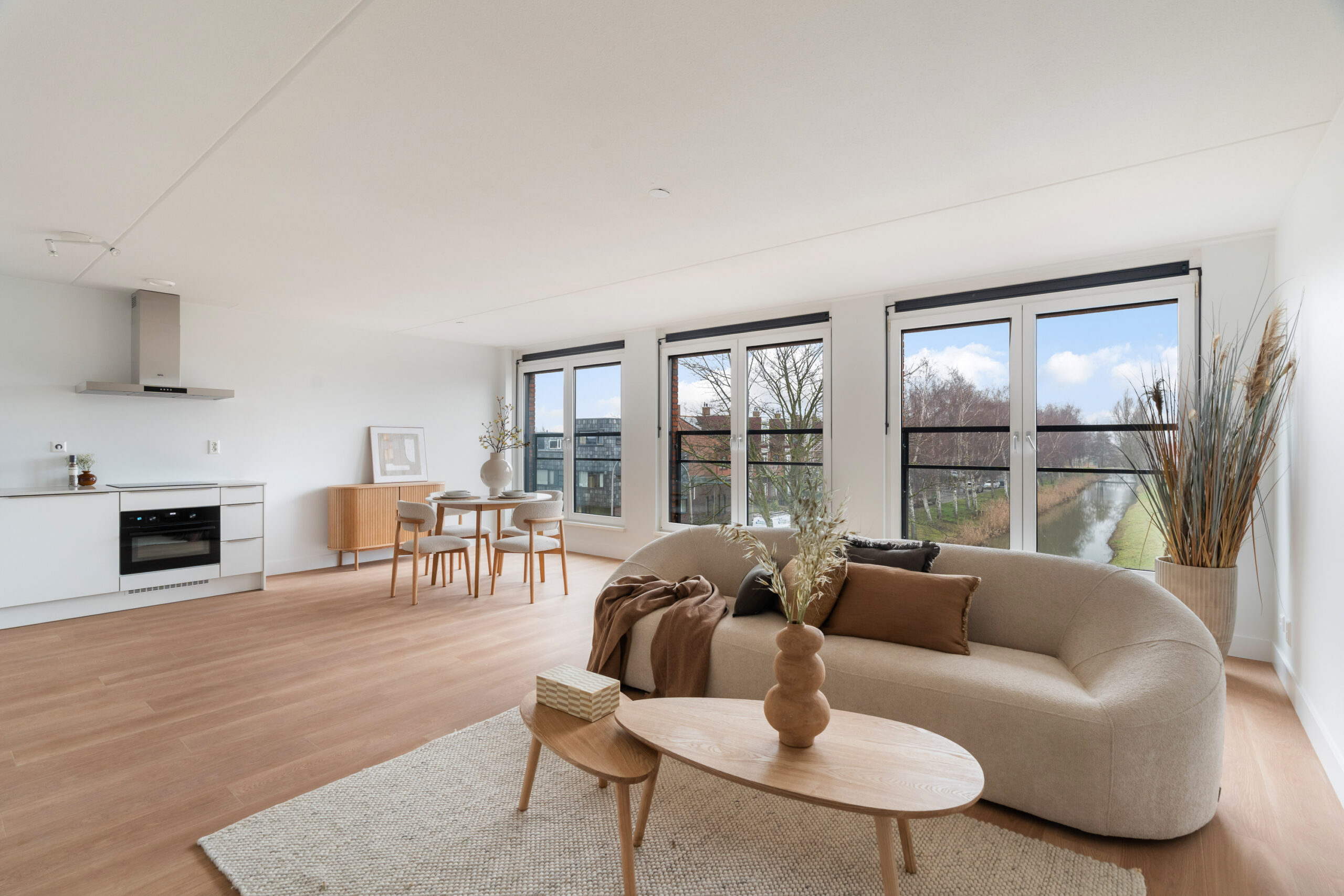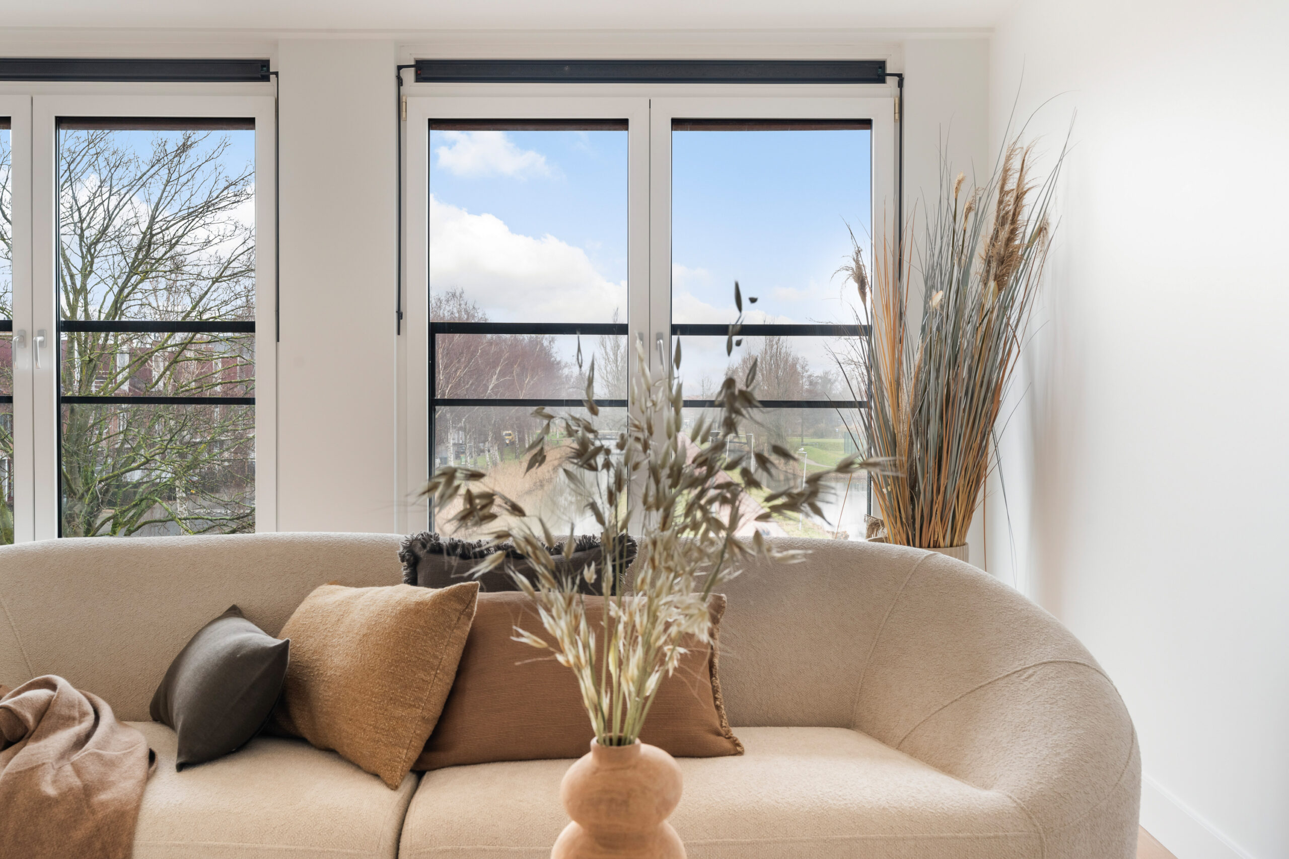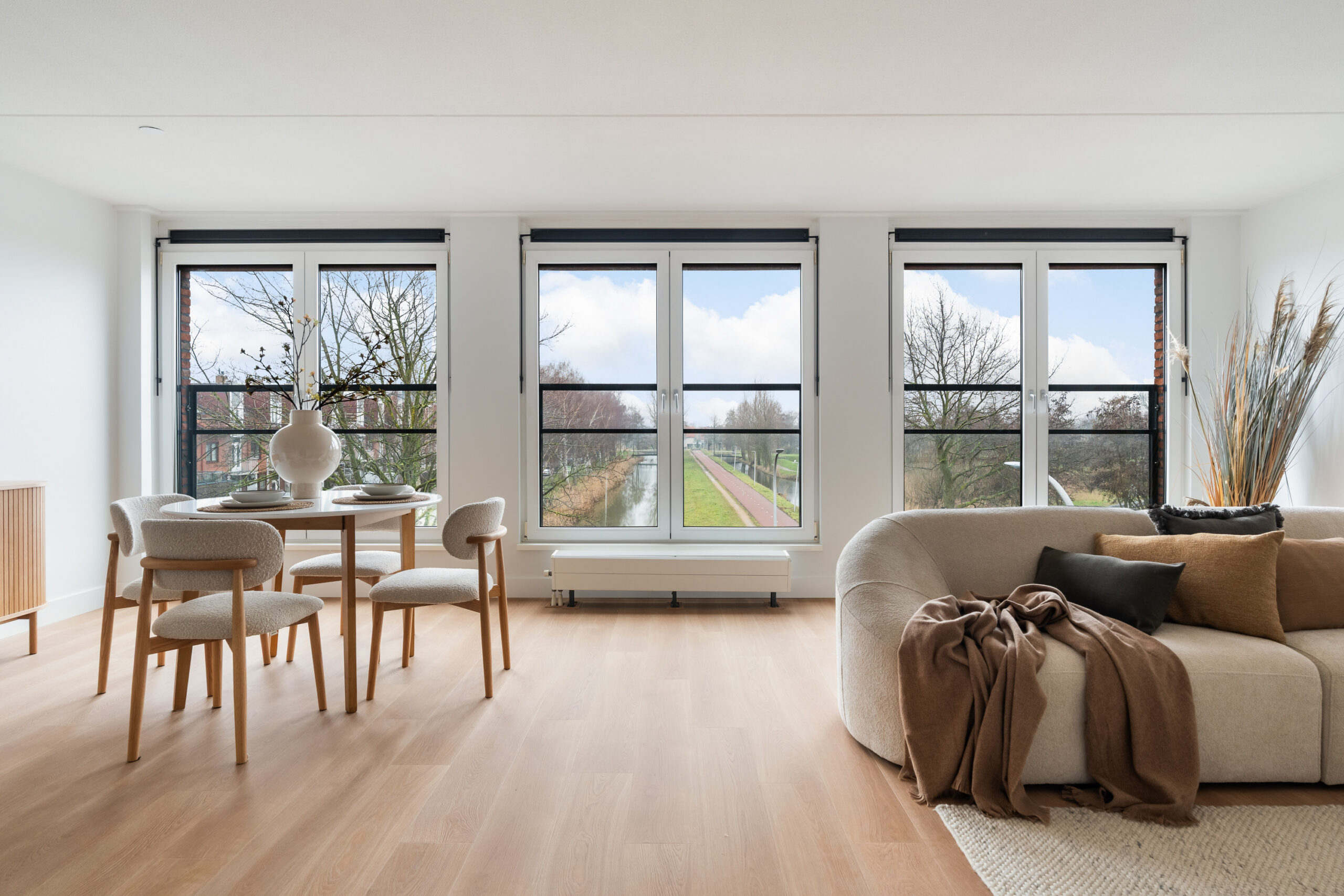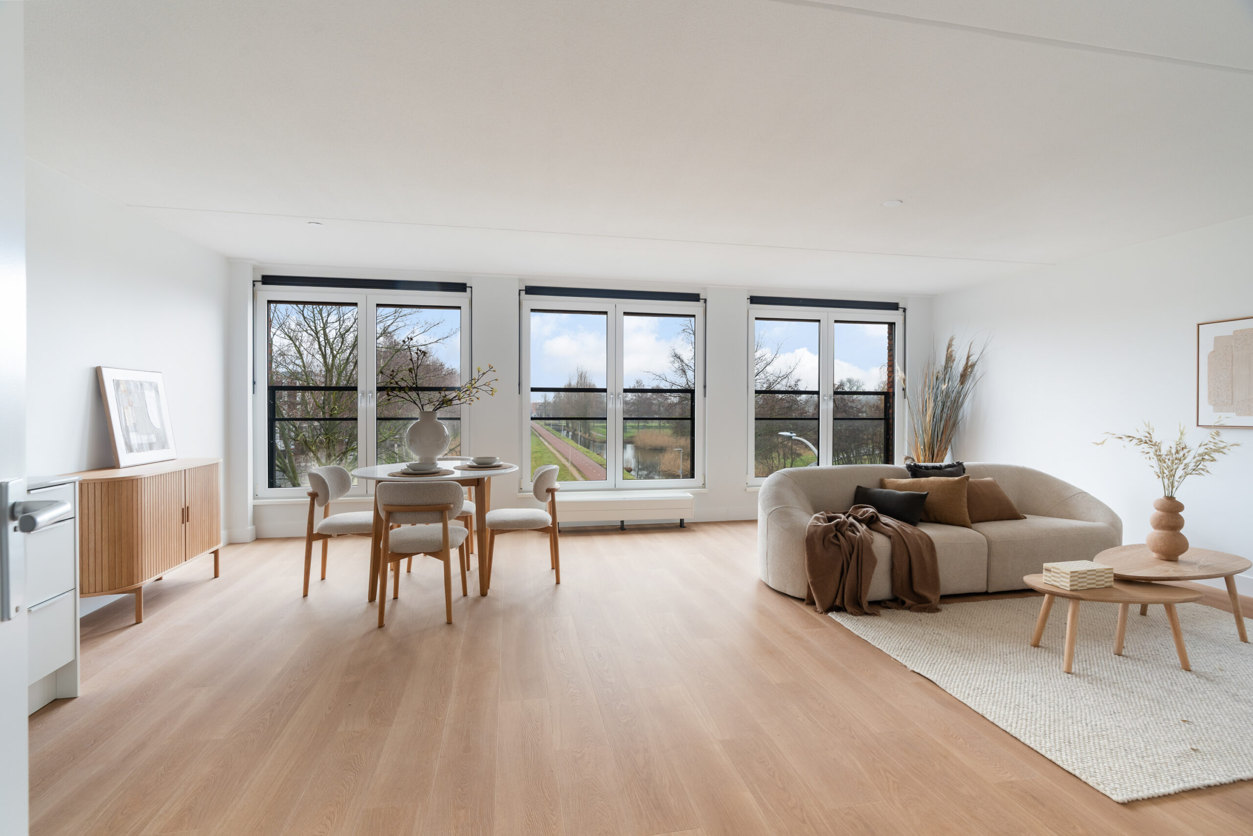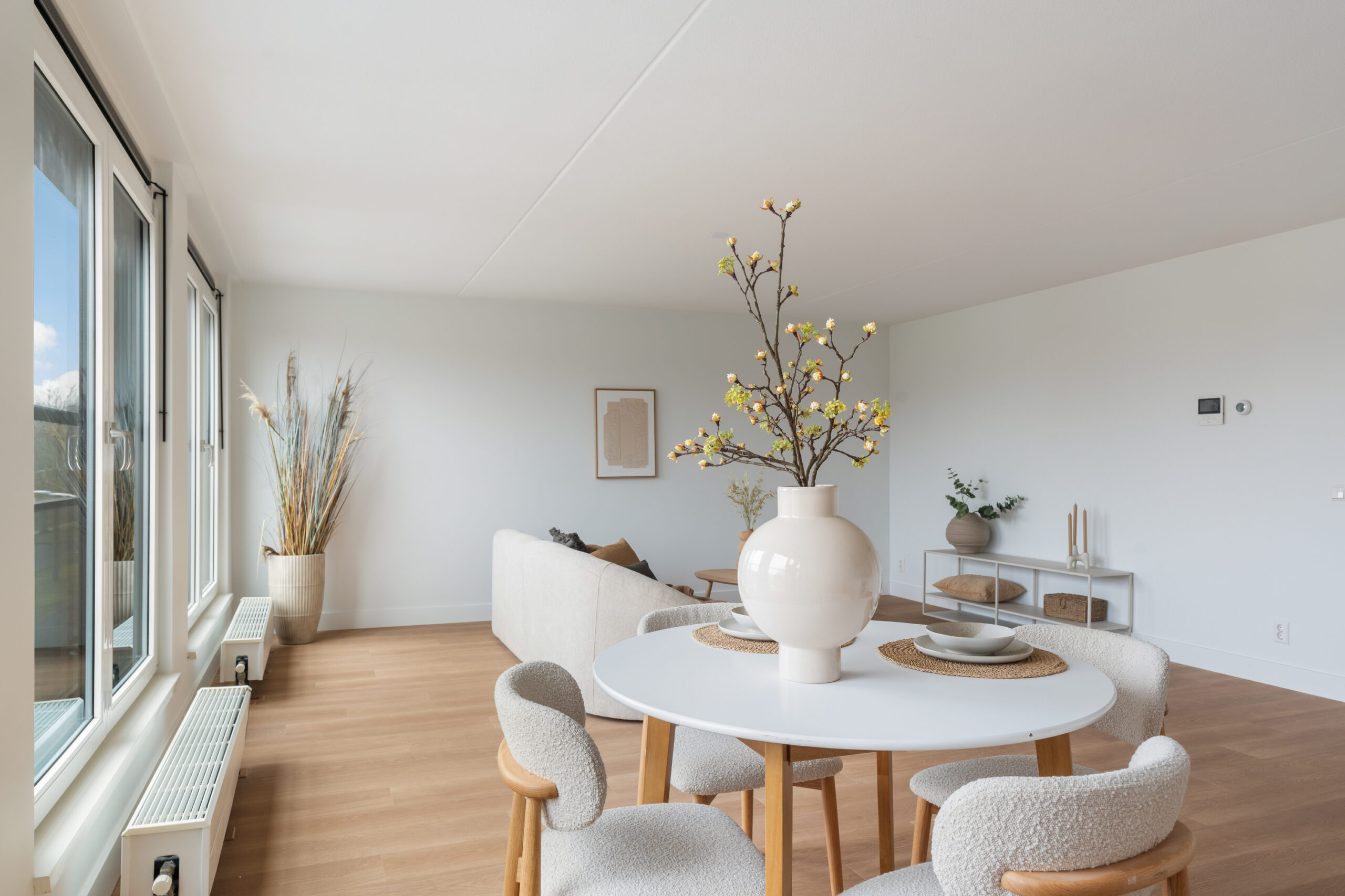 Lichte woonkamer met zuidligging en openslaande deuren met Frans balkon.