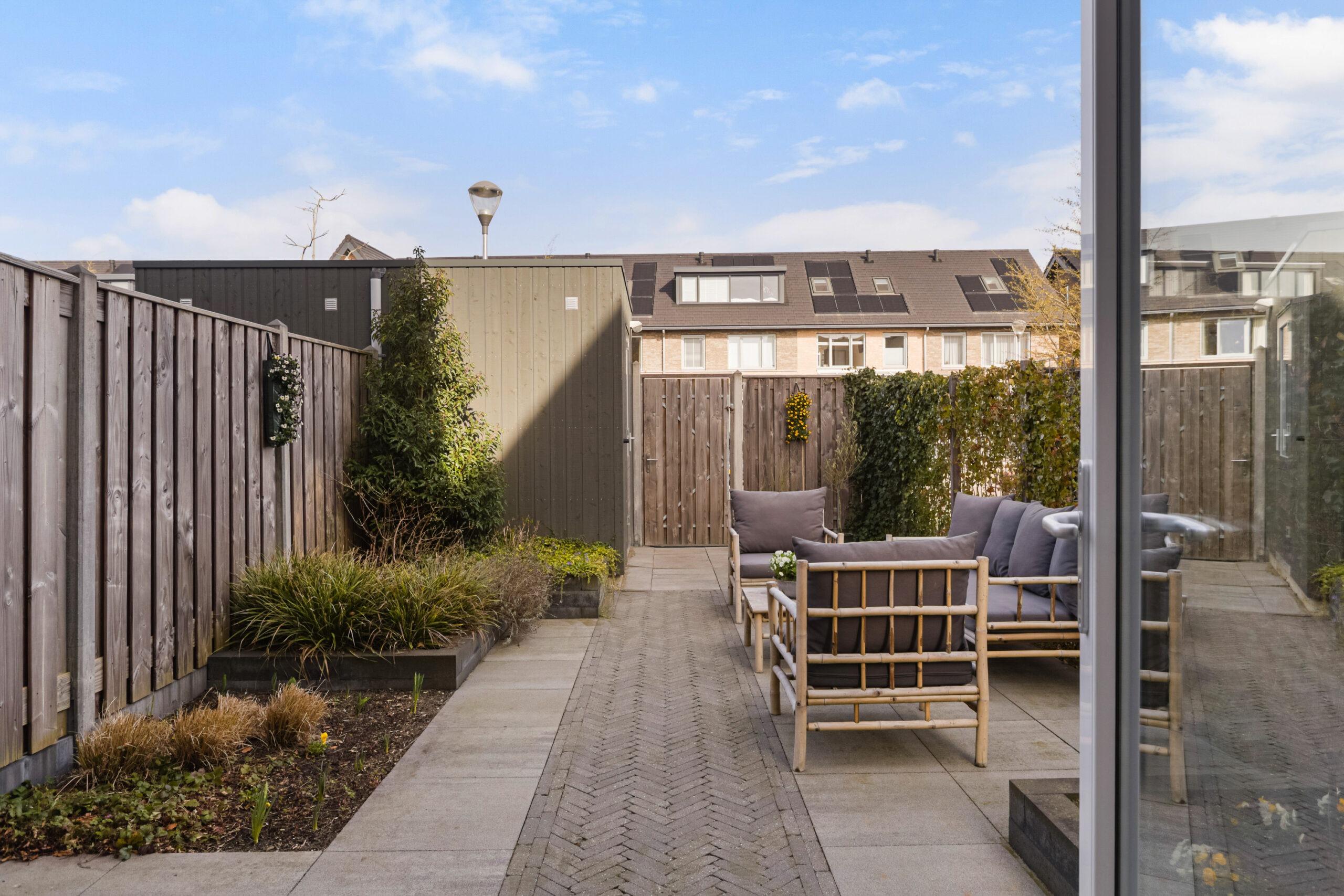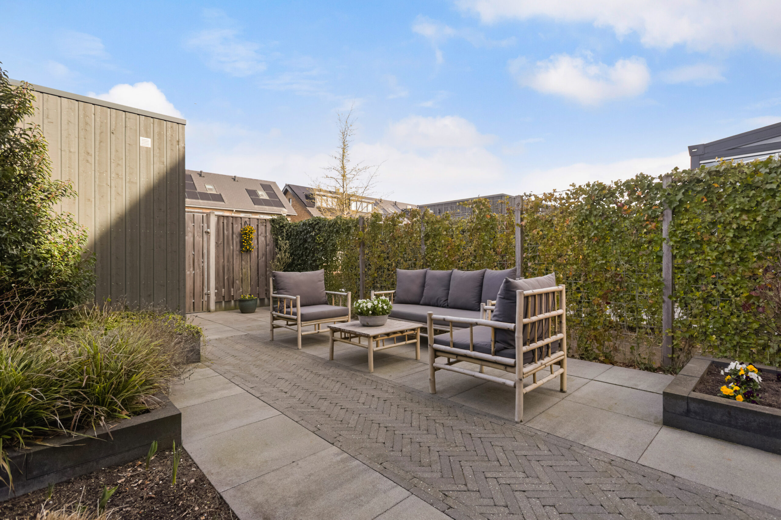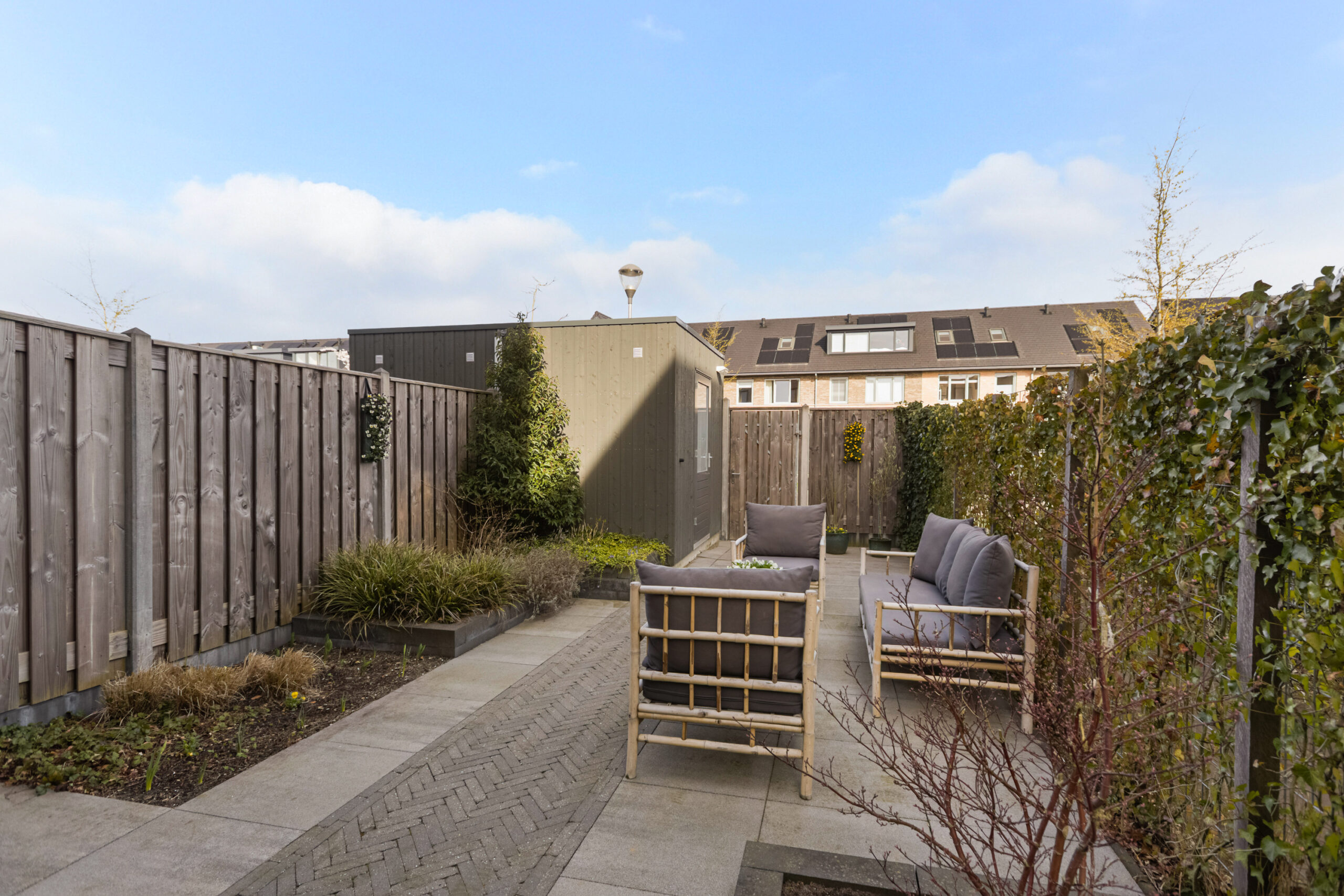 De woning beschikt over een leuk aangelegde tuin met groen en een terras waar je heerlijk kunt zitten. Achterin de tuin staat een berging voor fietsen en tuinspullen.