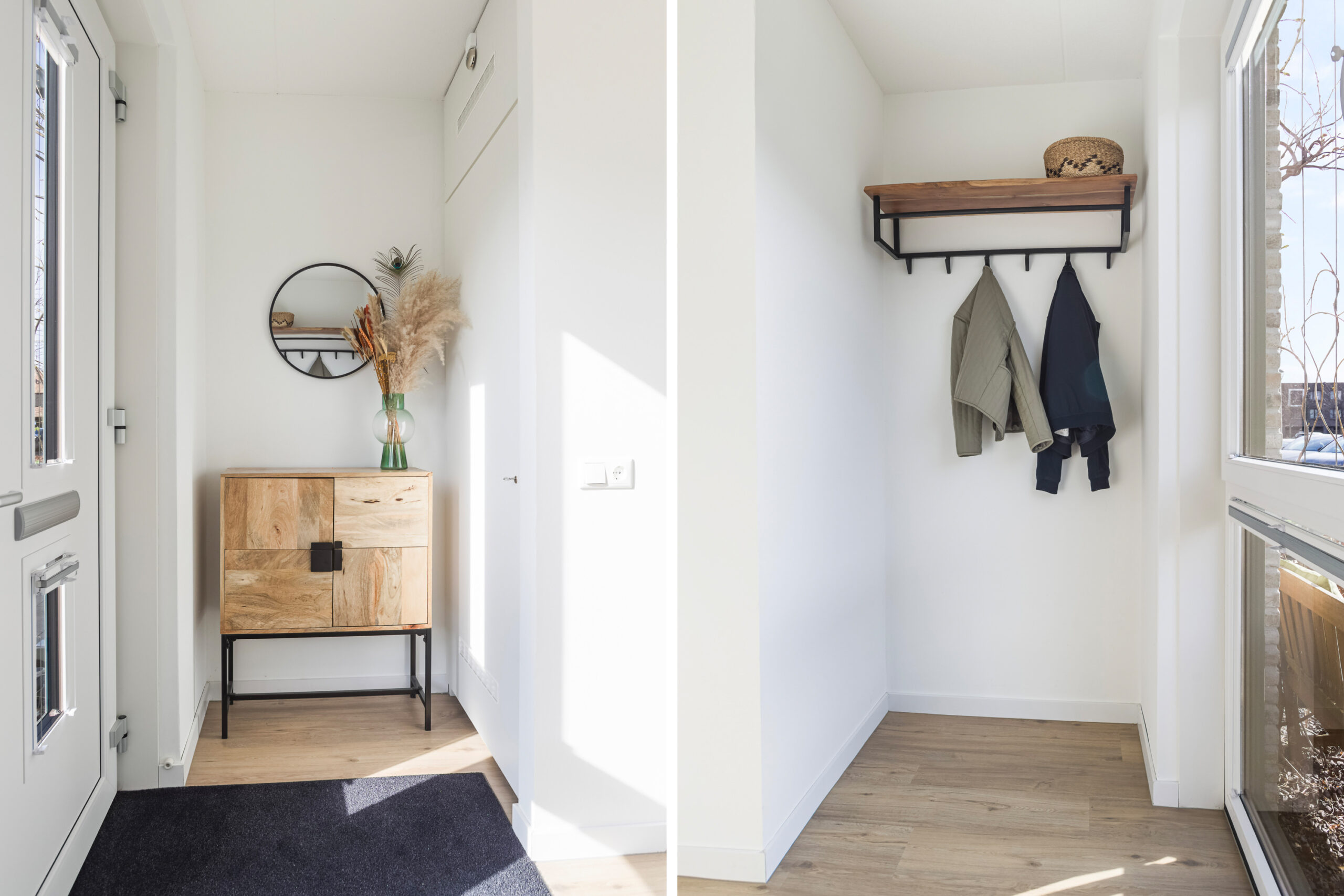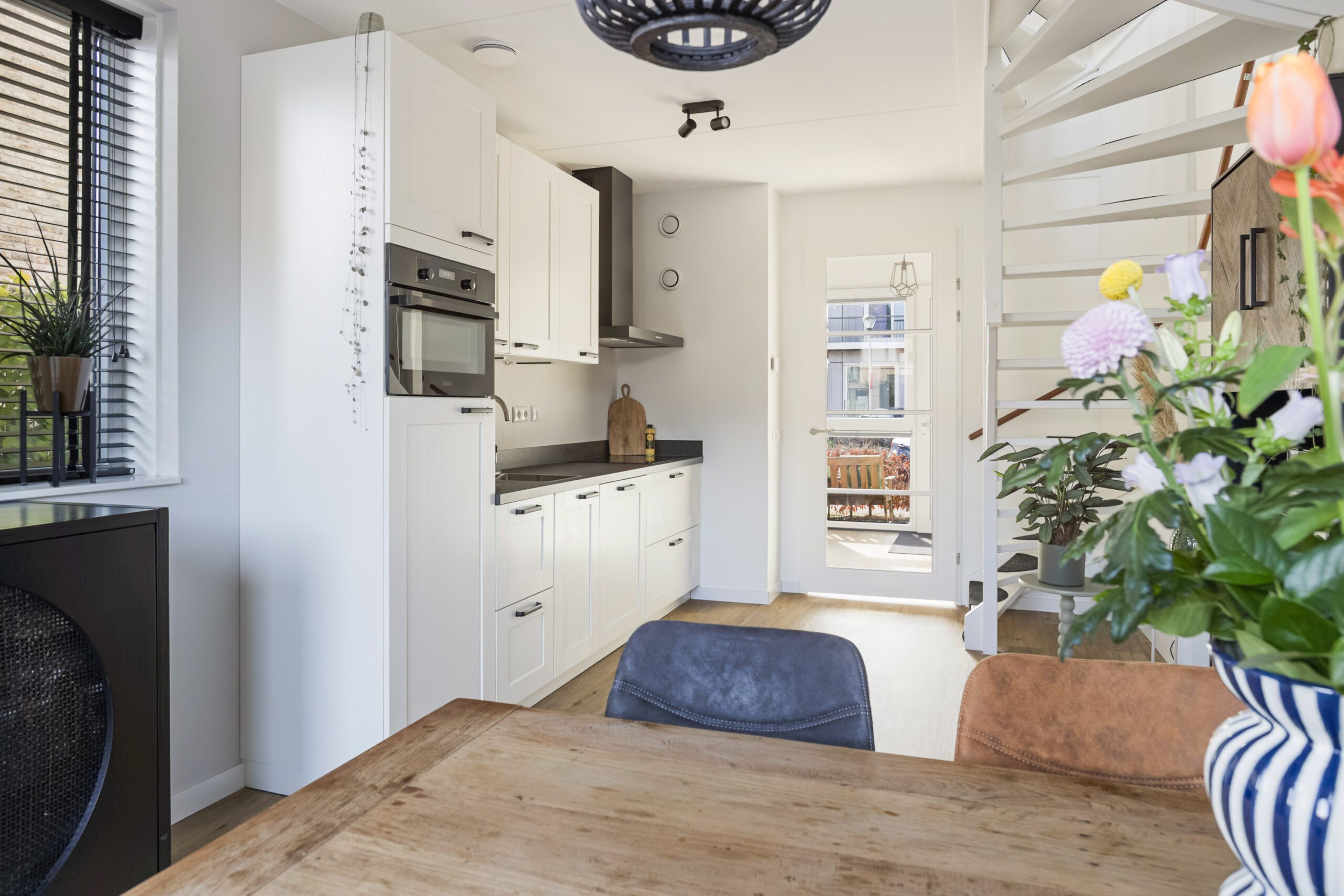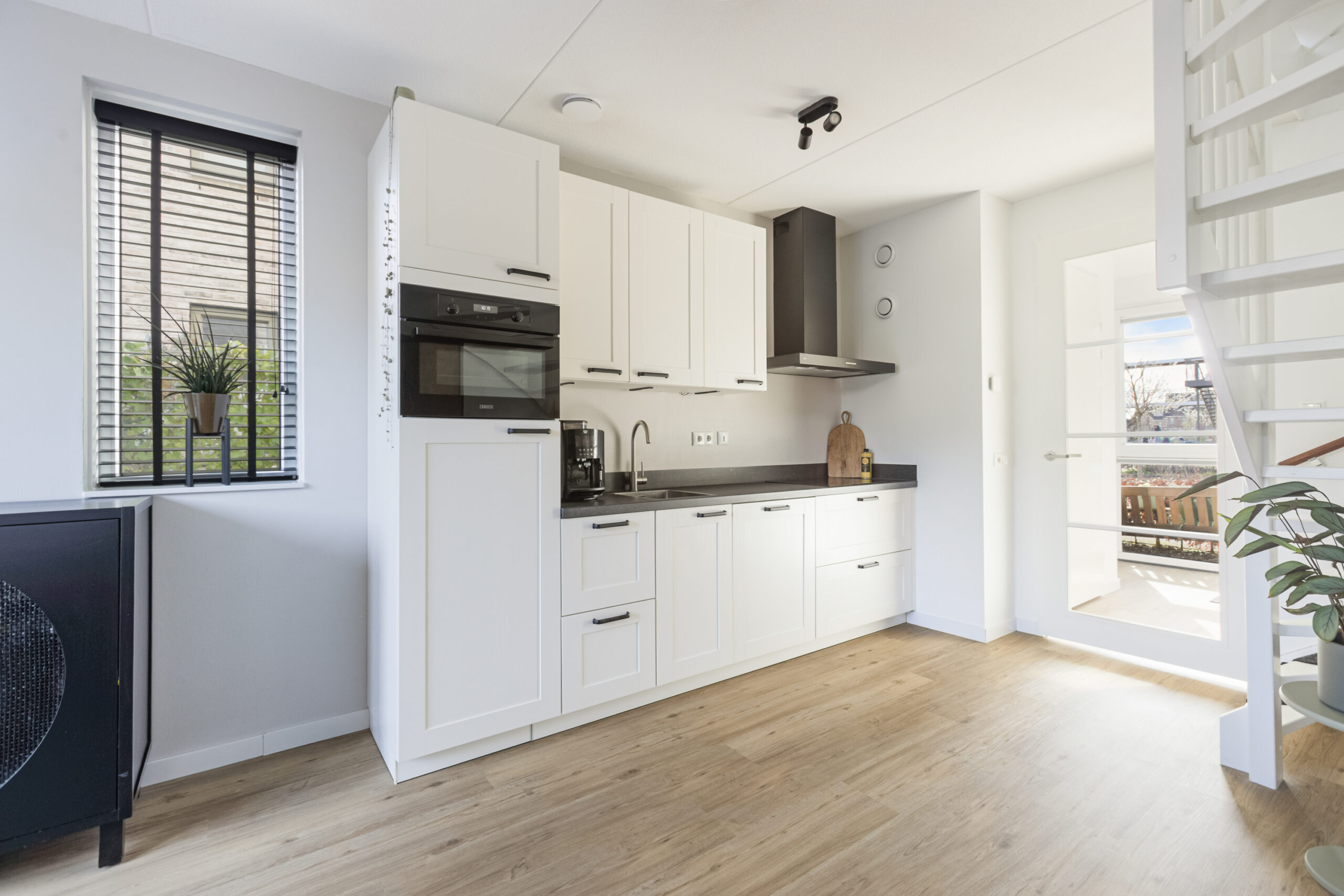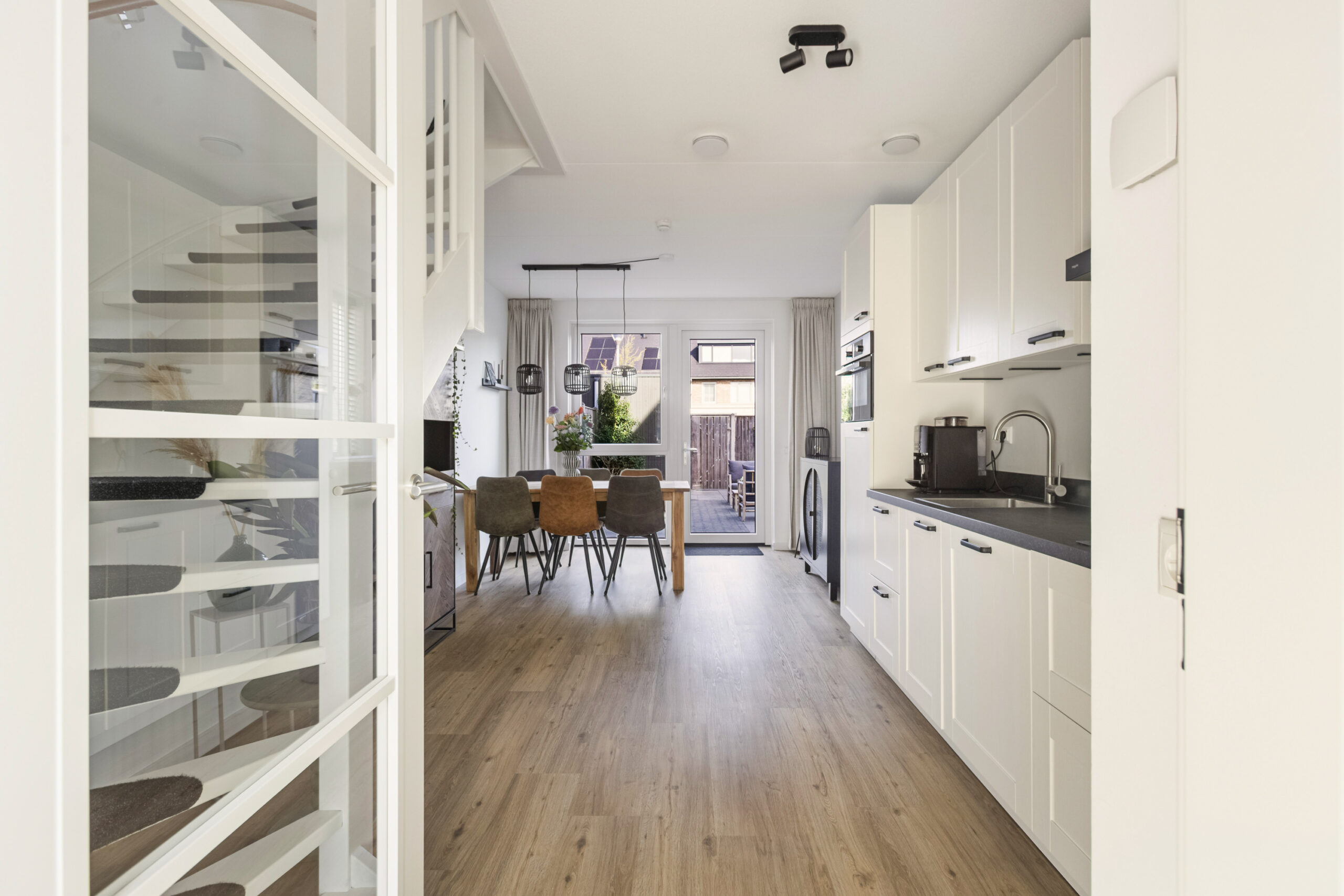 Entree/hal met meterkast, modern toilet en kast met opstelling van de warmtepomp. Moderne woonkeuken. Via de deur in de keuken is de tuin bereikbaar.