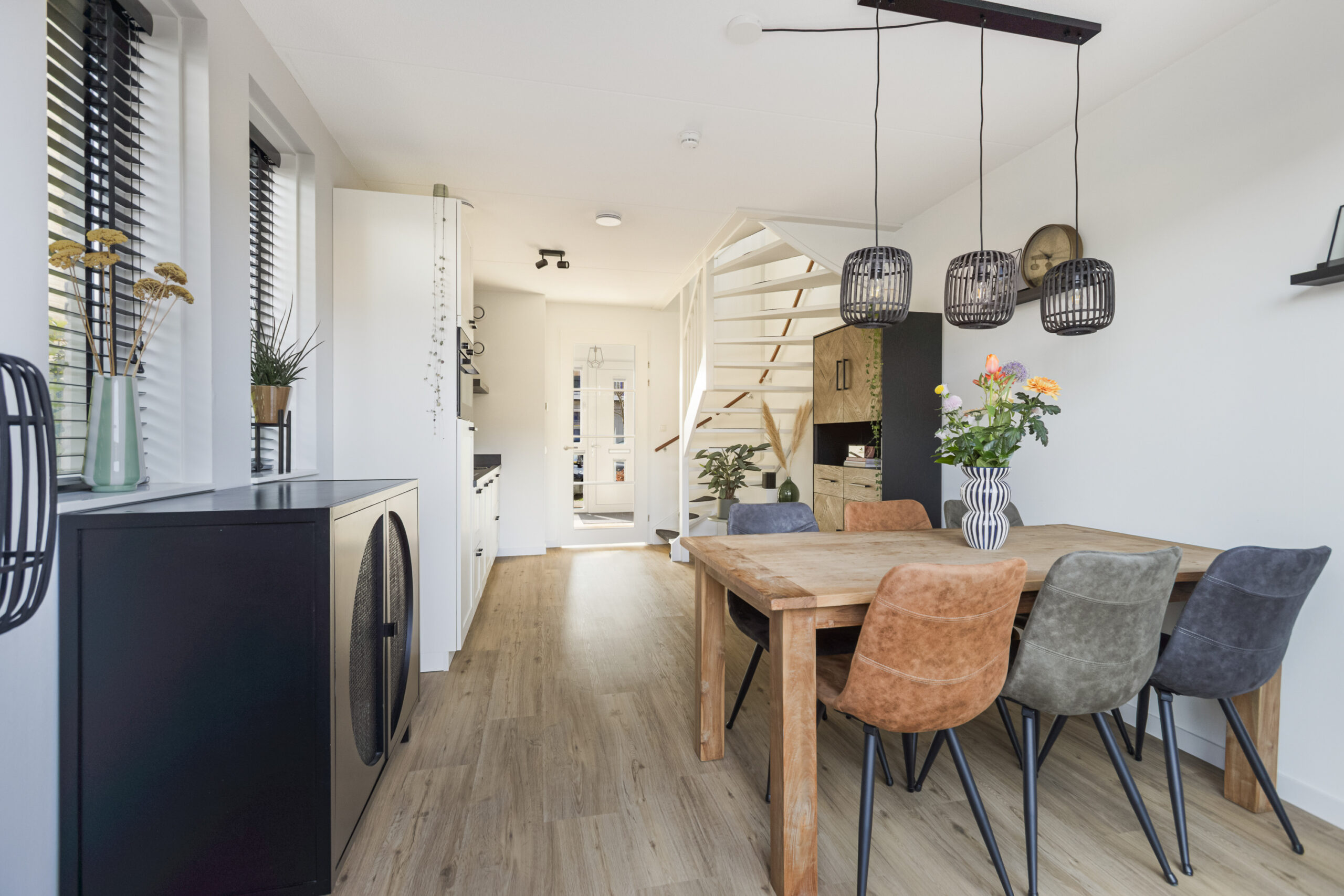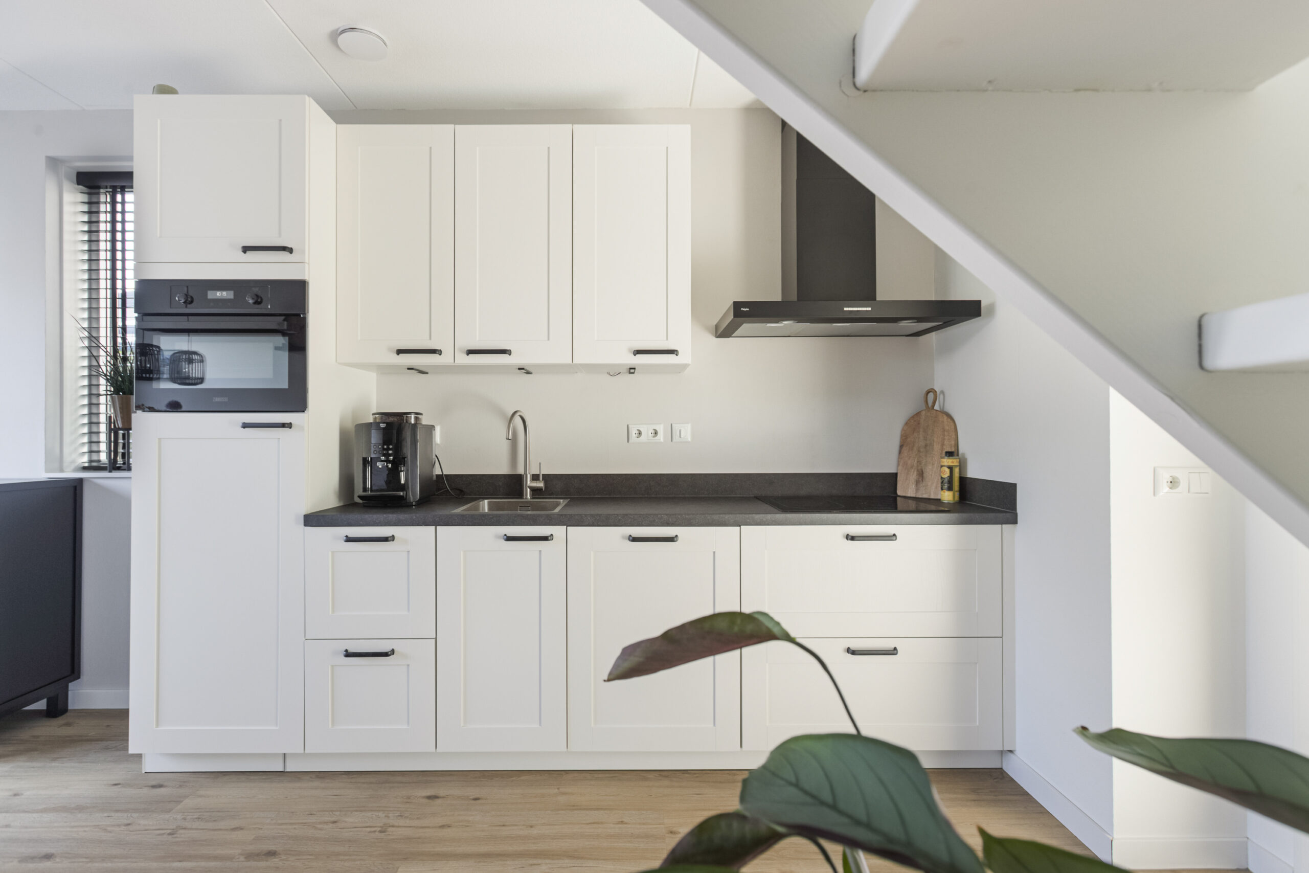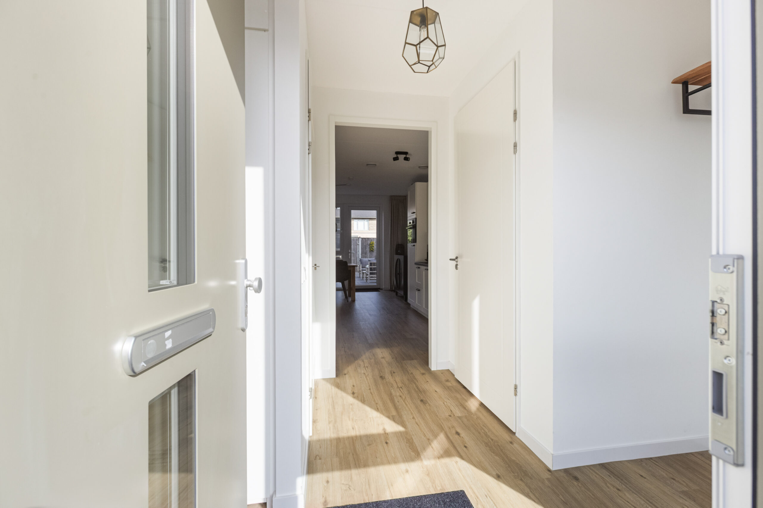 Entree/hal met meterkast, modern toilet en kast met opstelling van de warmtepomp. Moderne woonkeuken. Via de deur in de keuken is de tuin bereikbaar.