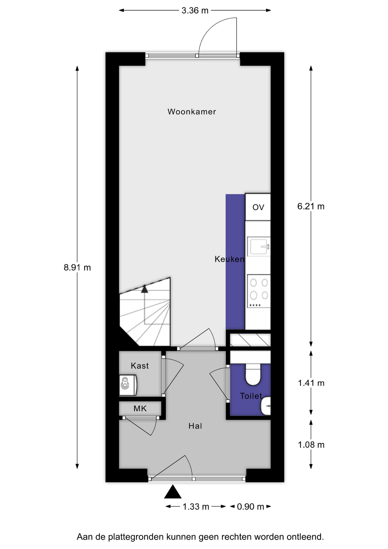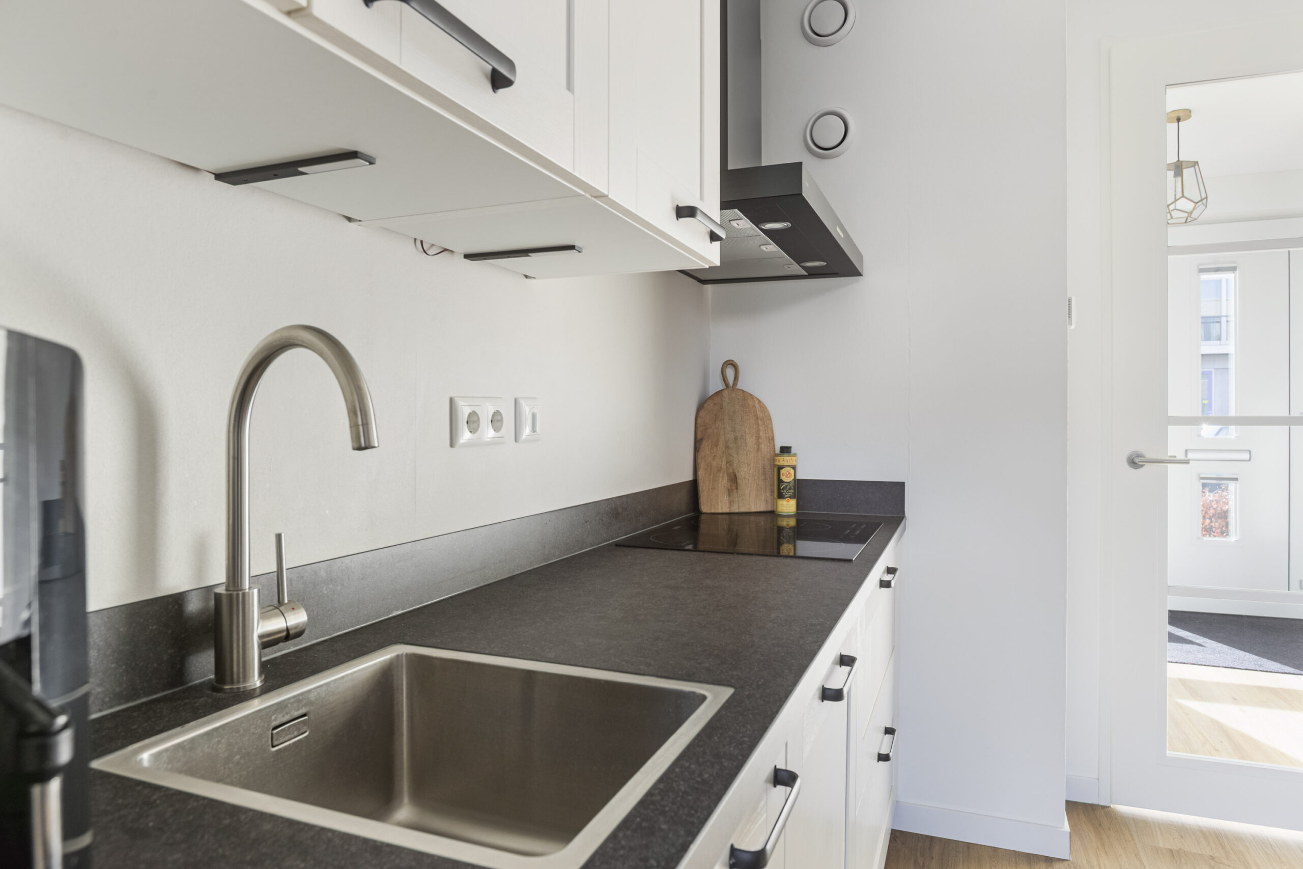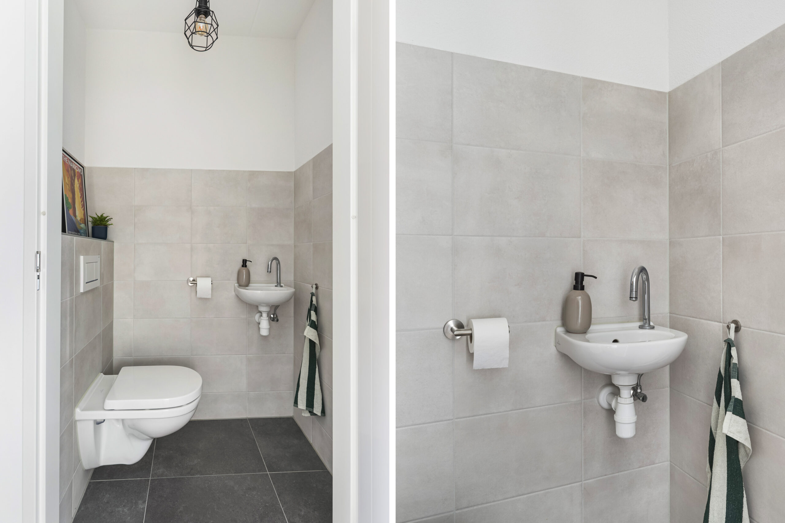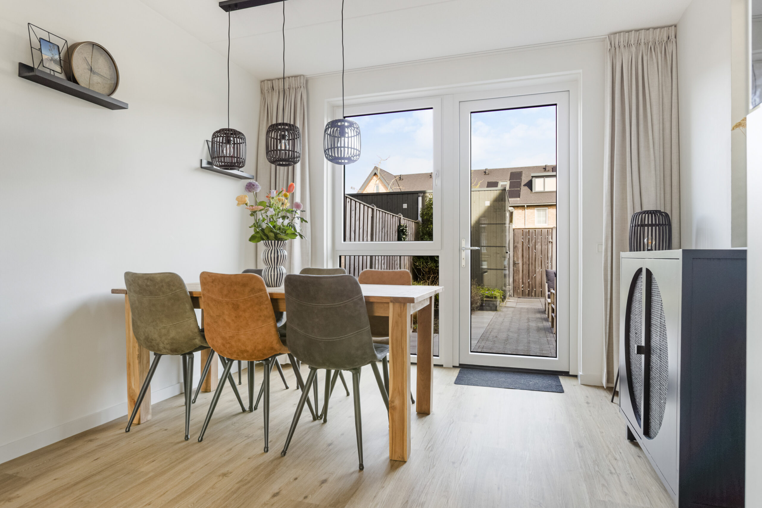 Entree/hal met meterkast, modern toilet en kast met opstelling van de warmtepomp. Moderne woonkeuken. Via de deur in de keuken is de tuin bereikbaar.