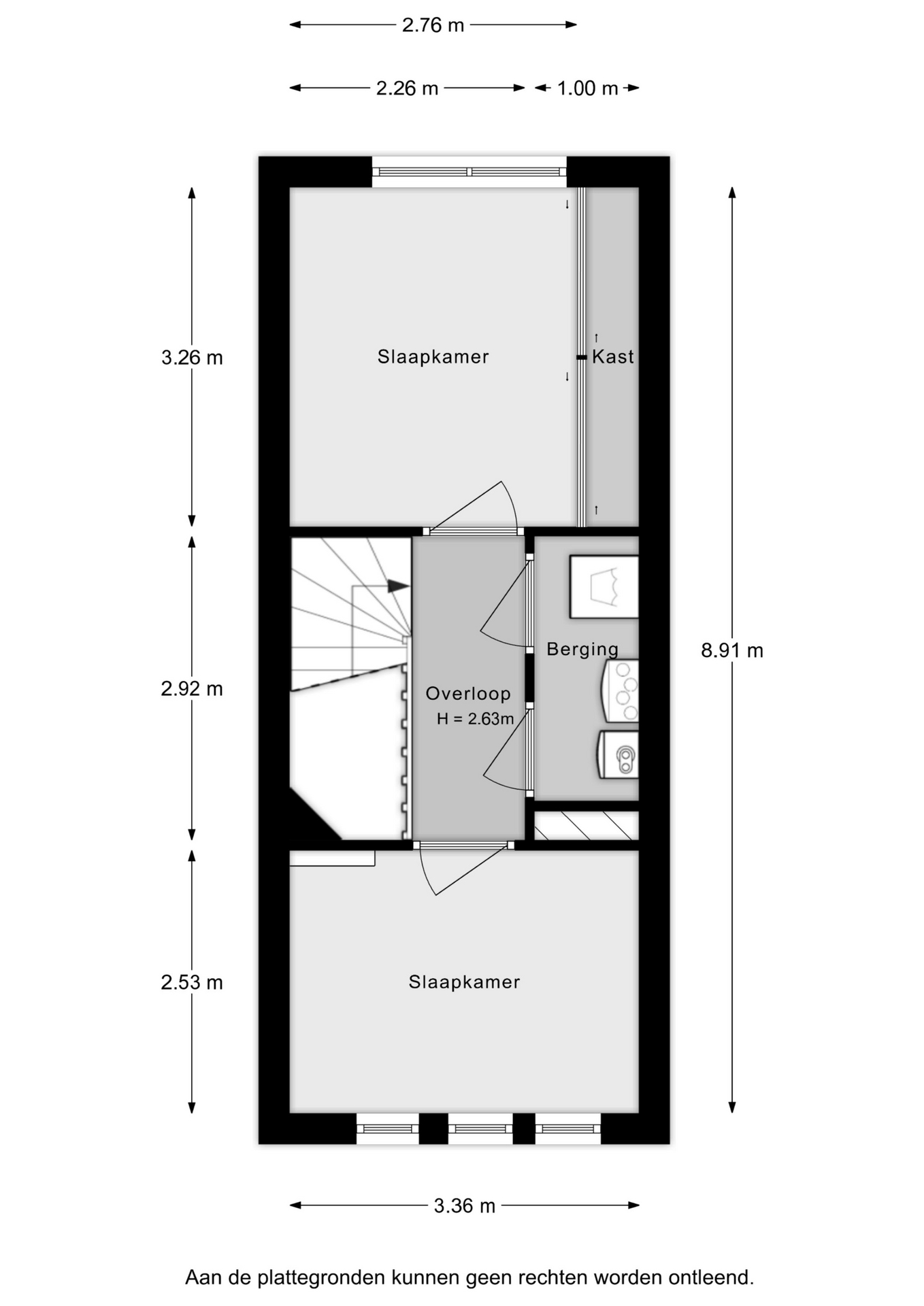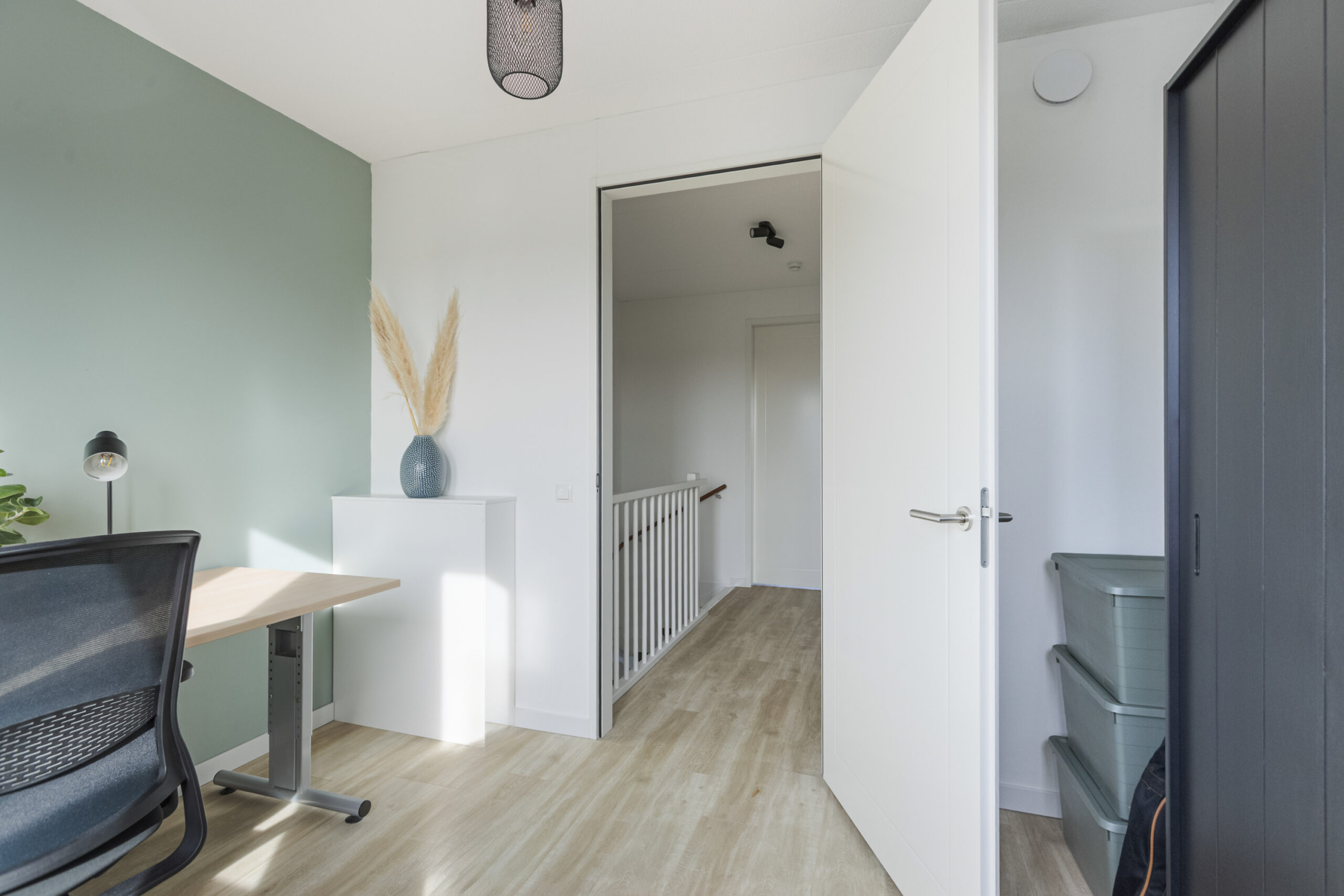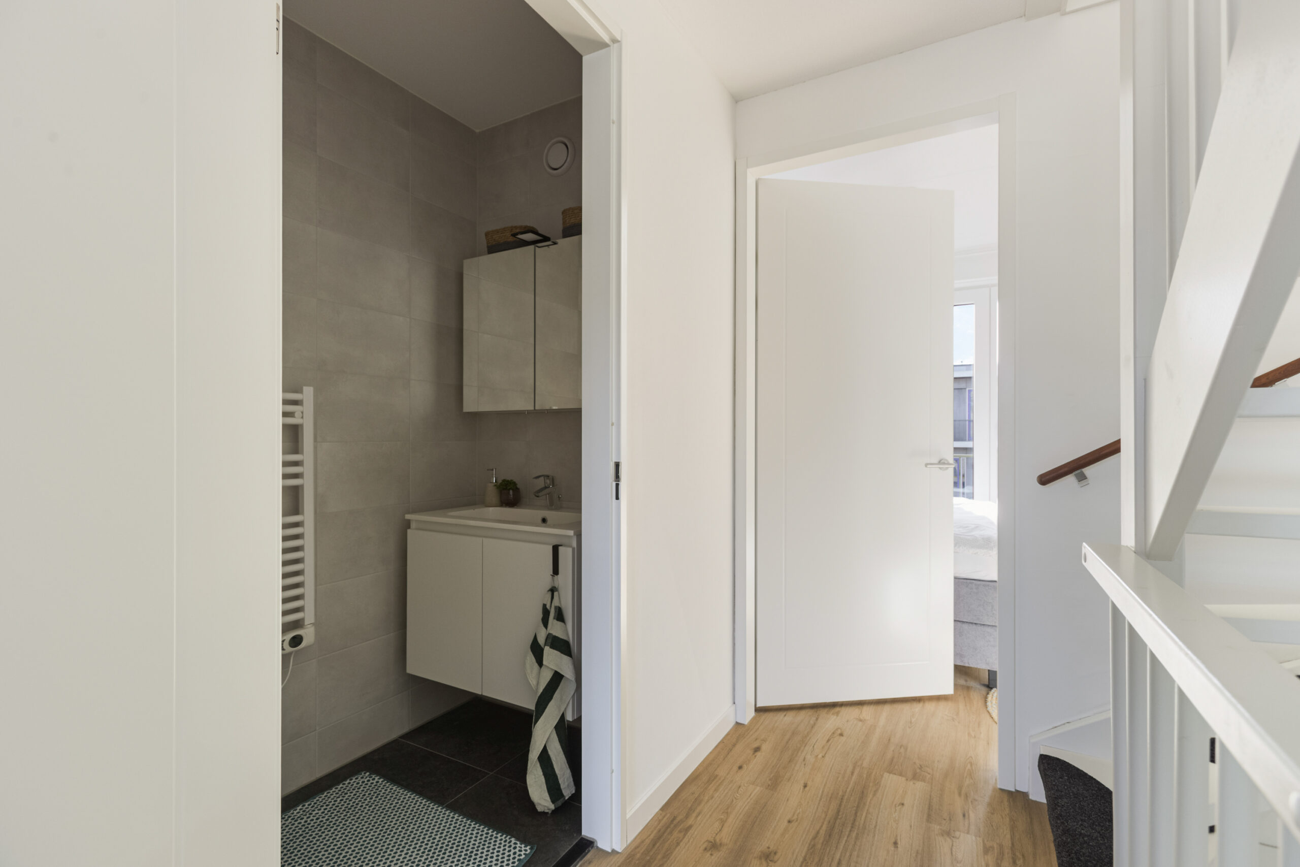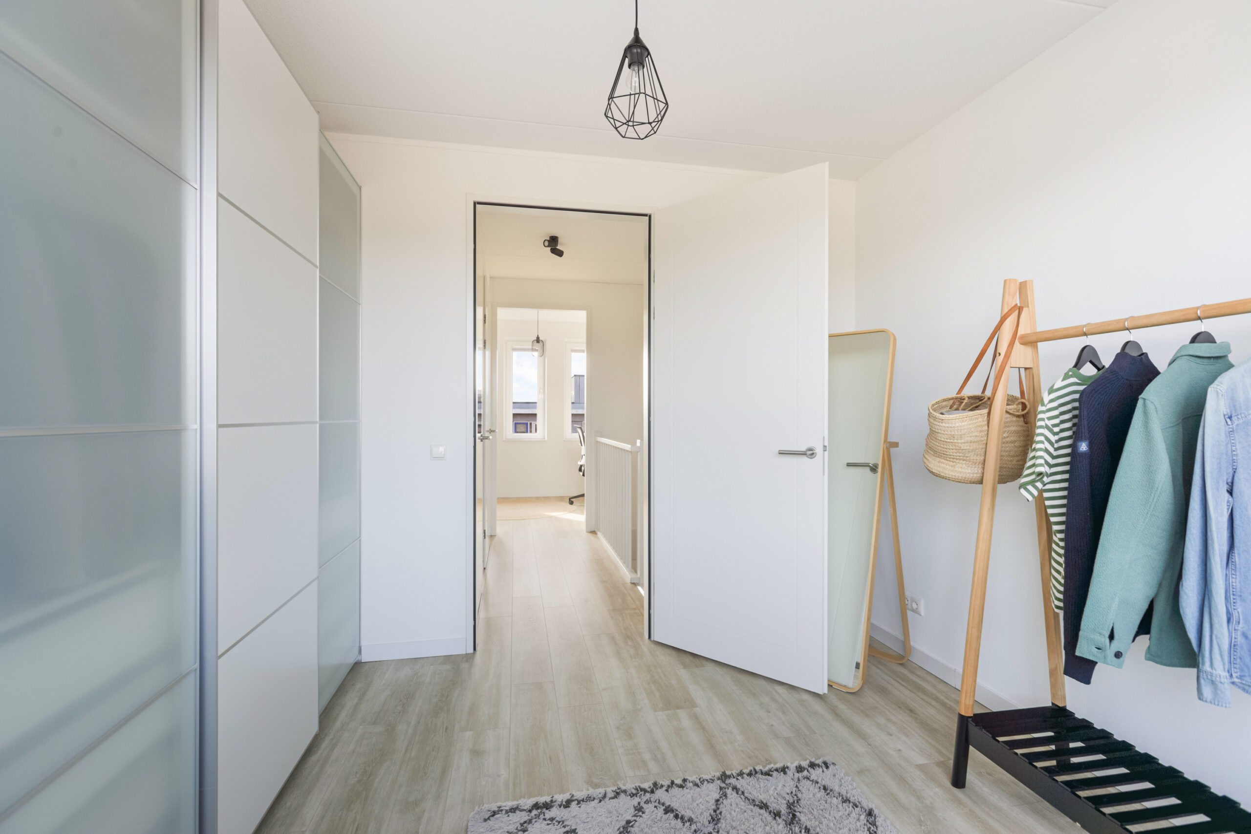 Overloop met toegang tot 2 slaapkamers. Op deze verdieping bevinden zich tevens het ventilatiesysteem, extra bergruimte en de aansluiting voor de wasmachine.