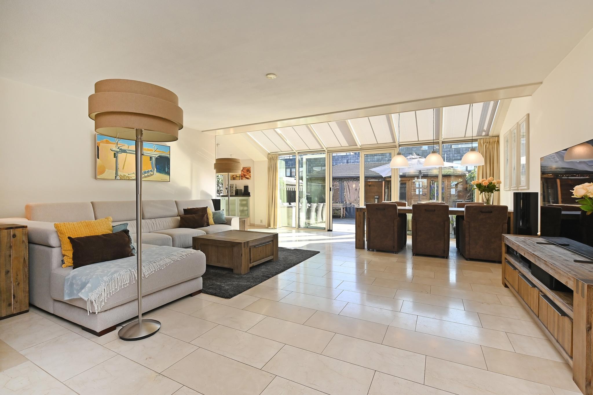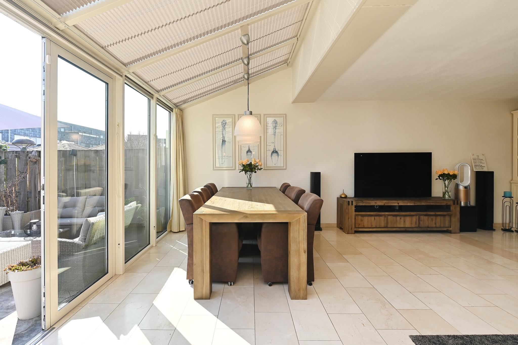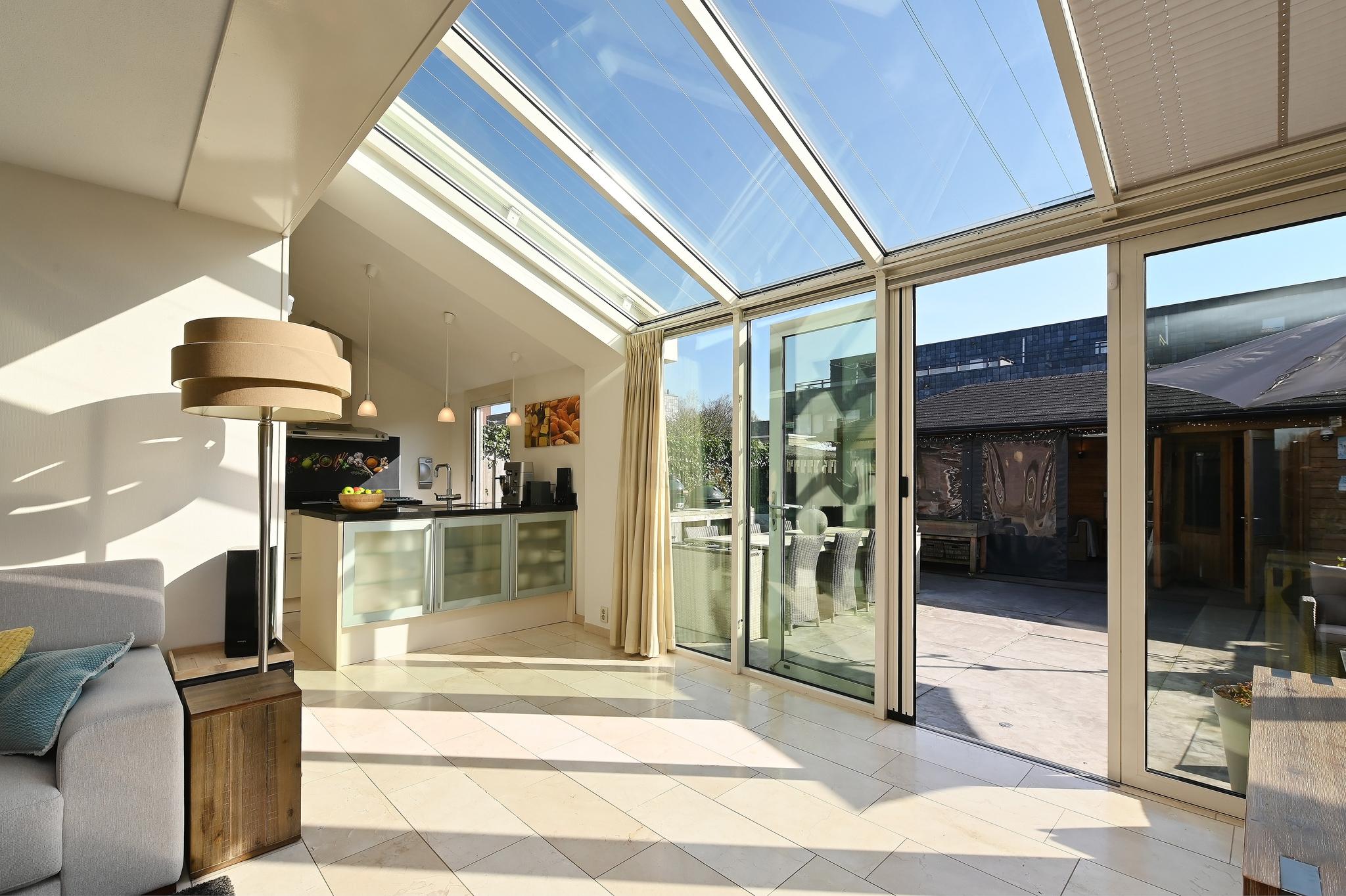 Grote woonkamer: De royale woonkamer is extra groot geworden door het bijtrekken van de garage bij de woning. Nu is er zelfs een thuis werkgedeelte aan de voorzijde gerealiseerd. Aan de achterzijde de grote serre (met zonwering) wat voor een fantastische daglichttoetreding zorgt.