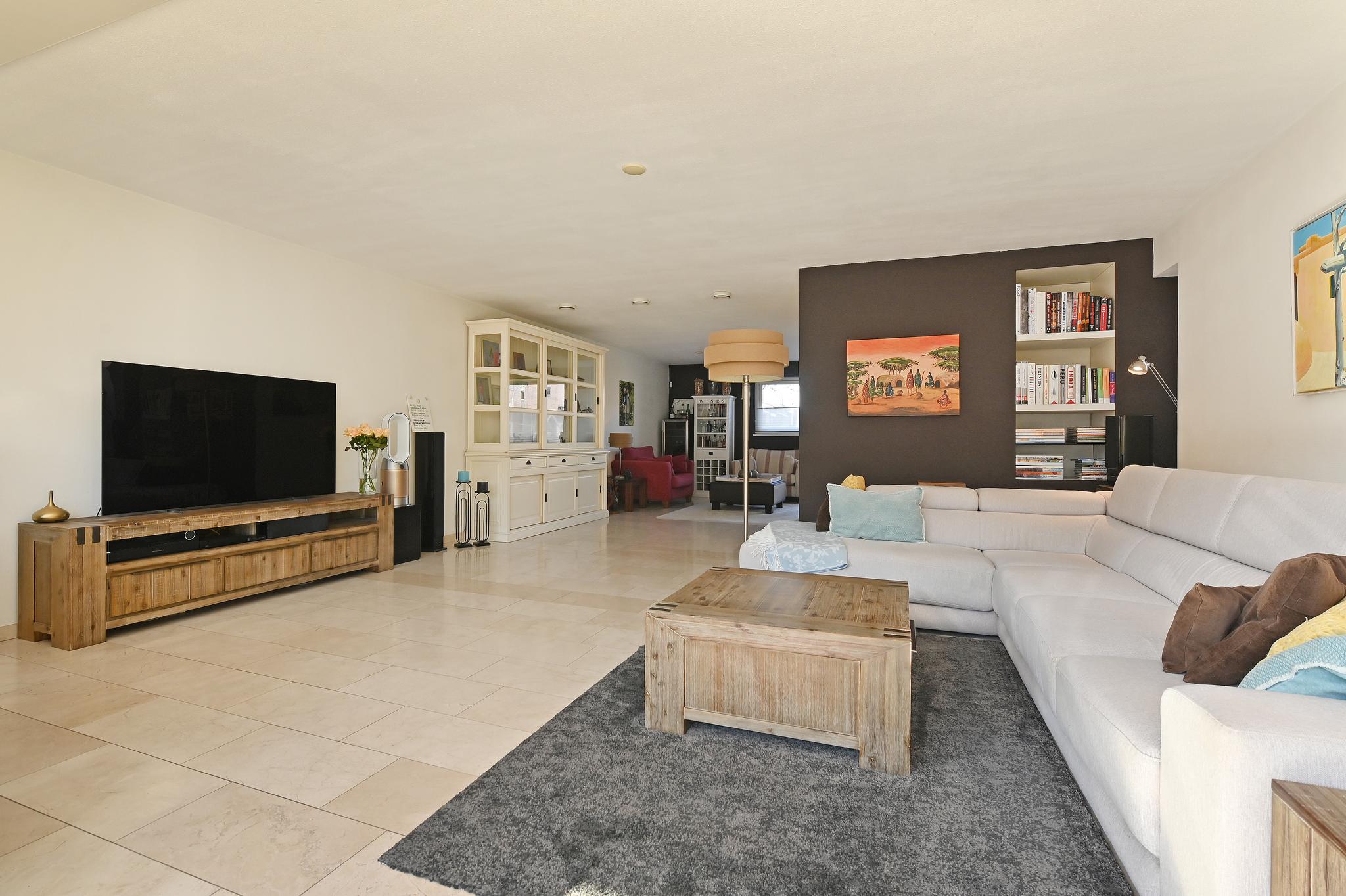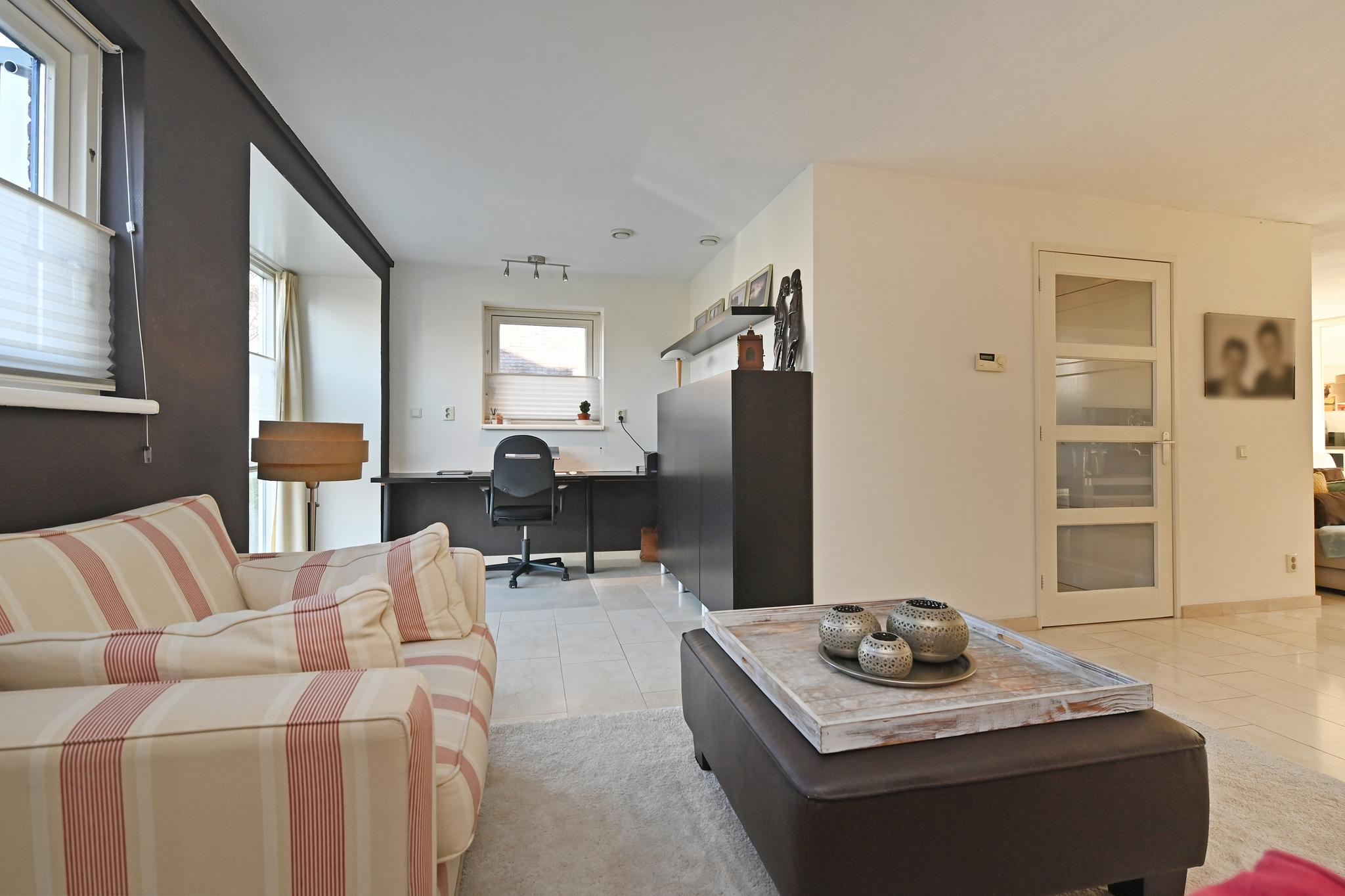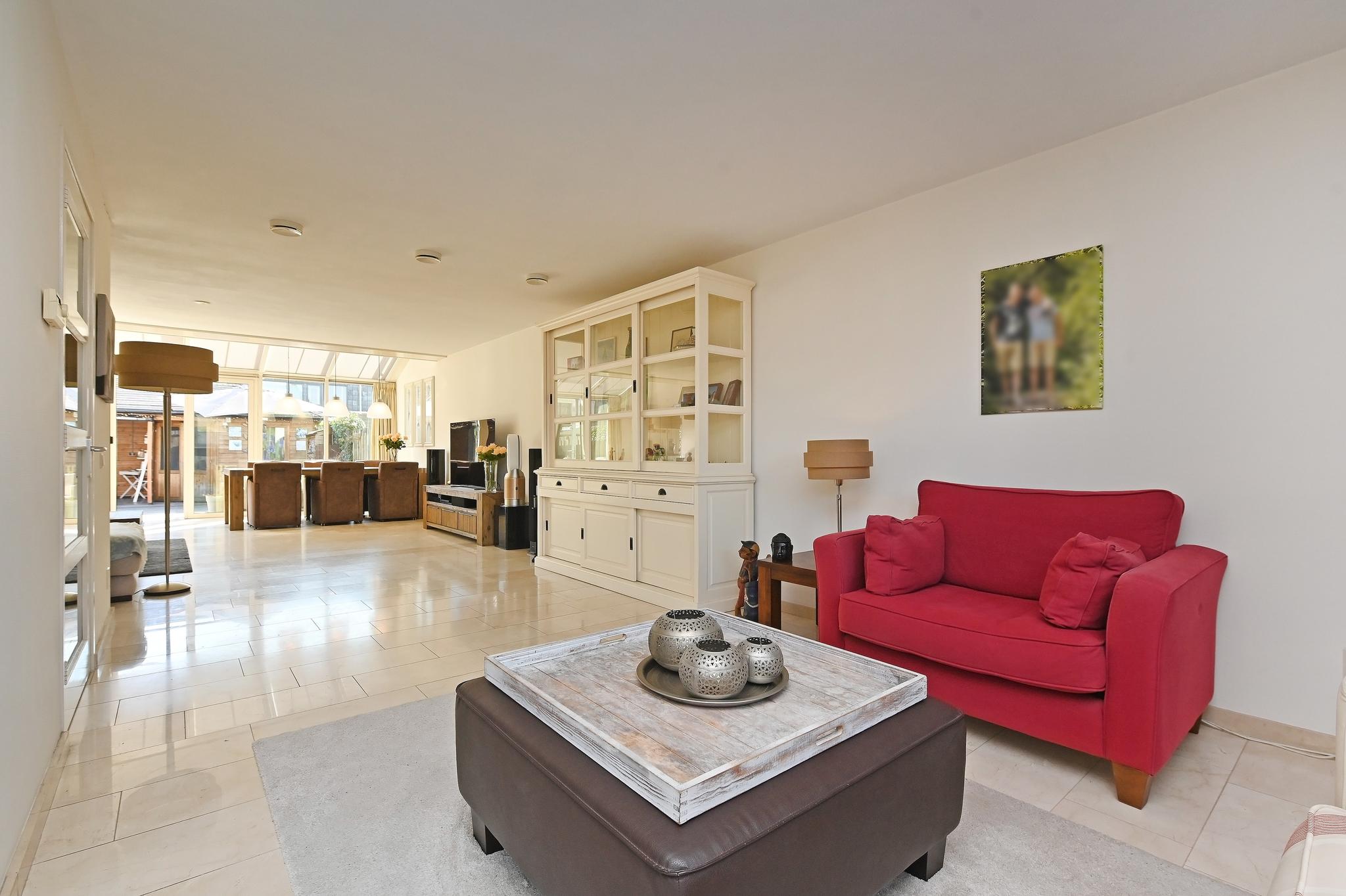 Grote woonkamer: De royale woonkamer is extra groot geworden door het bijtrekken van de garage bij de woning. Nu is er zelfs een thuis werkgedeelte aan de voorzijde gerealiseerd. Aan de achterzijde de grote serre (met zonwering) wat voor een fantastische daglichttoetreding zorgt.